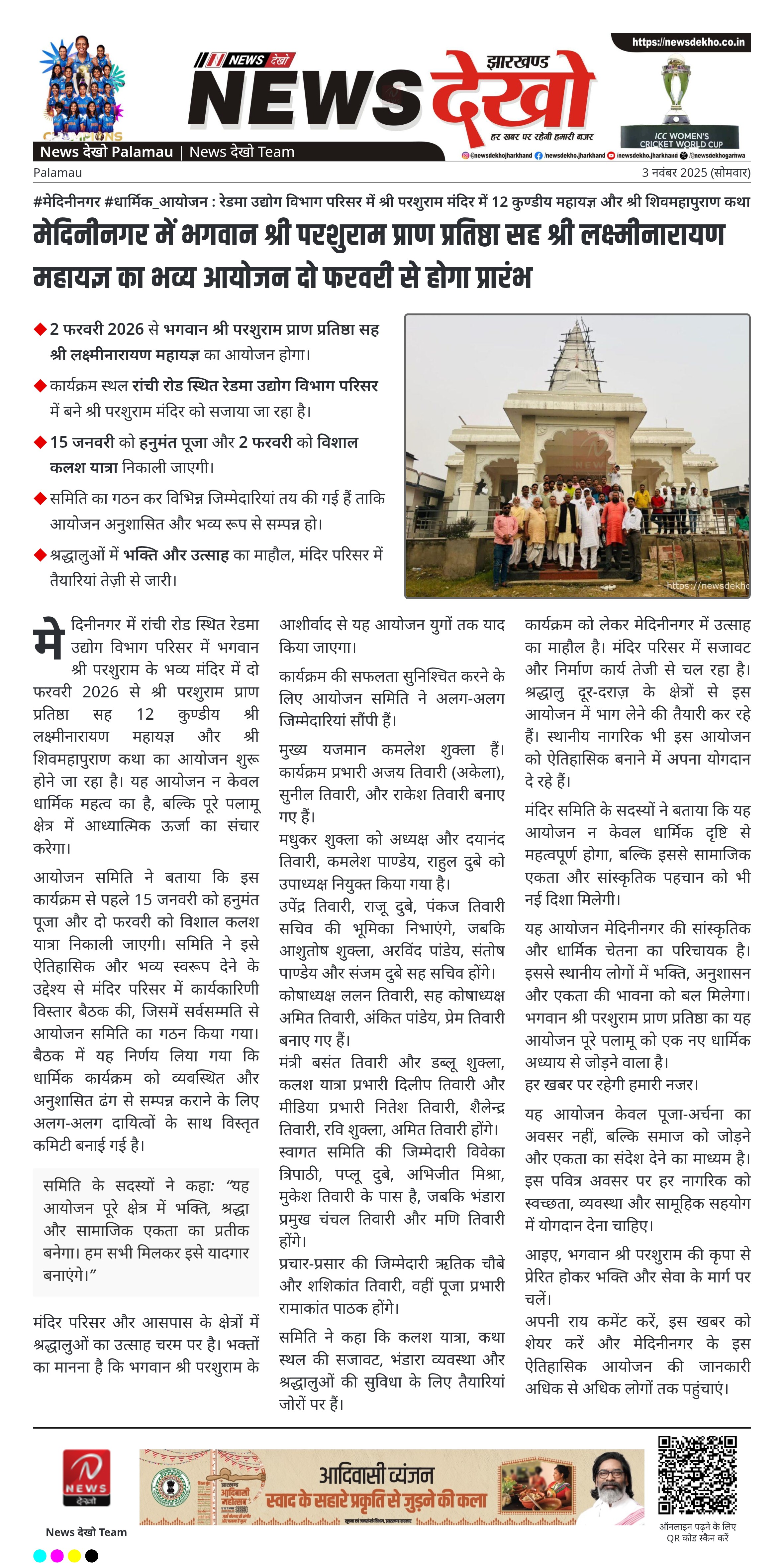 #मेदिनीनगर #धार्मिक_आयोजन : रेडमा उद्योग विभाग परिसर में श्री परशुराम मंदिर में 12 कुण्डीय महायज्ञ और श्री शिवमहापुराण कथा से गूंजेगा भक्ति का माहौल