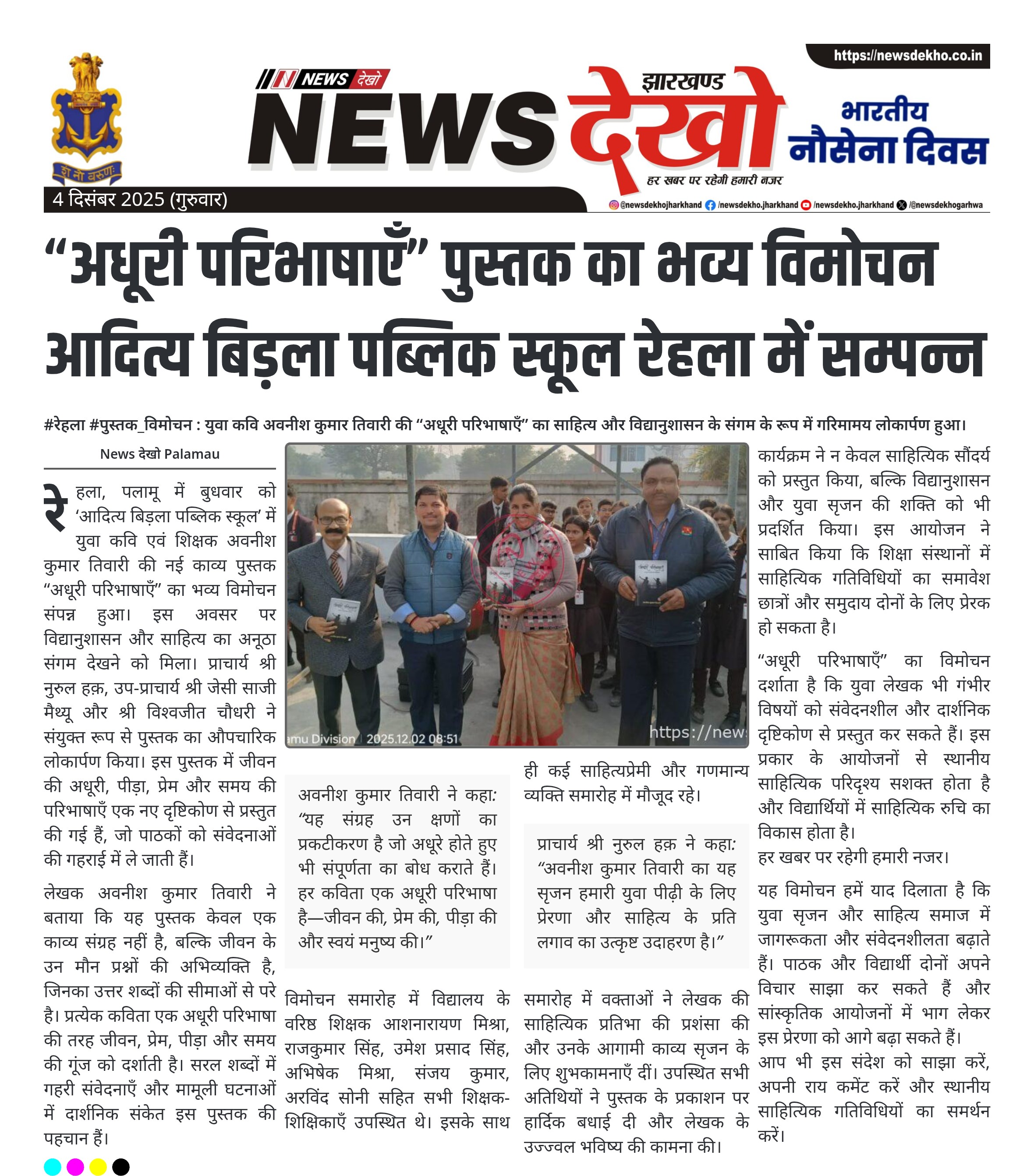 रेहला, पलामू में बुधवार को ‘आदित्य बिड़ला पब्लिक स्कूल’ में युवा कवि एवं शिक्षक अवनीश कुमार तिवारी की नई काव्य पुस्तक “अधूरी परिभाषाएँ” का भव्य विमोचन संपन्न हुआ। इस अवसर पर विद्यानुशासन और साहित्य का अनूठा संगम देखने को मिला। प्राचार्य श्री नुरुल हक़, उप-प्राचार्य श्री जेसी साजी मैथ्यू और श्री विश्वजीत चौधरी ने संयुक्त रूप से पुस्तक का औपचारिक लोकार्पण किया। इस पुस्तक में जीवन की अधूरी, पीड़ा, प्रेम और समय की परिभाषाएँ एक नए दृष्टिकोण से प्रस्तुत की गई हैं, जो पाठकों को संवेदनाओं की गहराई में ले जाती हैं।