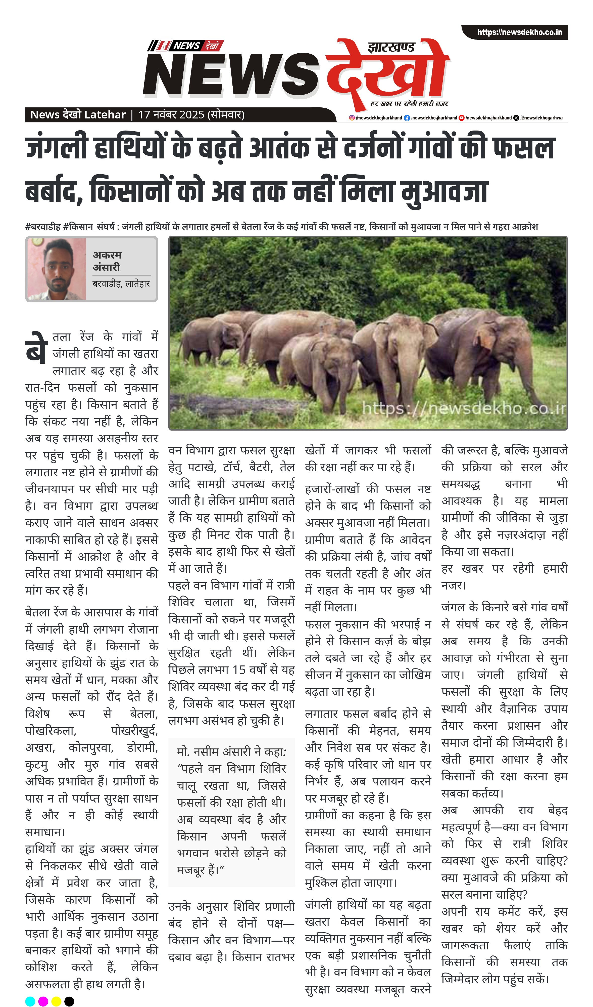 जंगल के किनारे बसे गांव वर्षों से संघर्ष कर रहे हैं, लेकिन अब समय है कि उनकी आवाज़ को गंभीरता से सुना जाए। जंगली हाथियों से फसलों की सुरक्षा के लिए स्थायी और वैज्ञानिक उपाय तैयार करना प्रशासन और समाज दोनों की जिम्मेदारी है। खेती हमारा आधार है और किसानों की रक्षा करना हम सबका कर्तव्य।