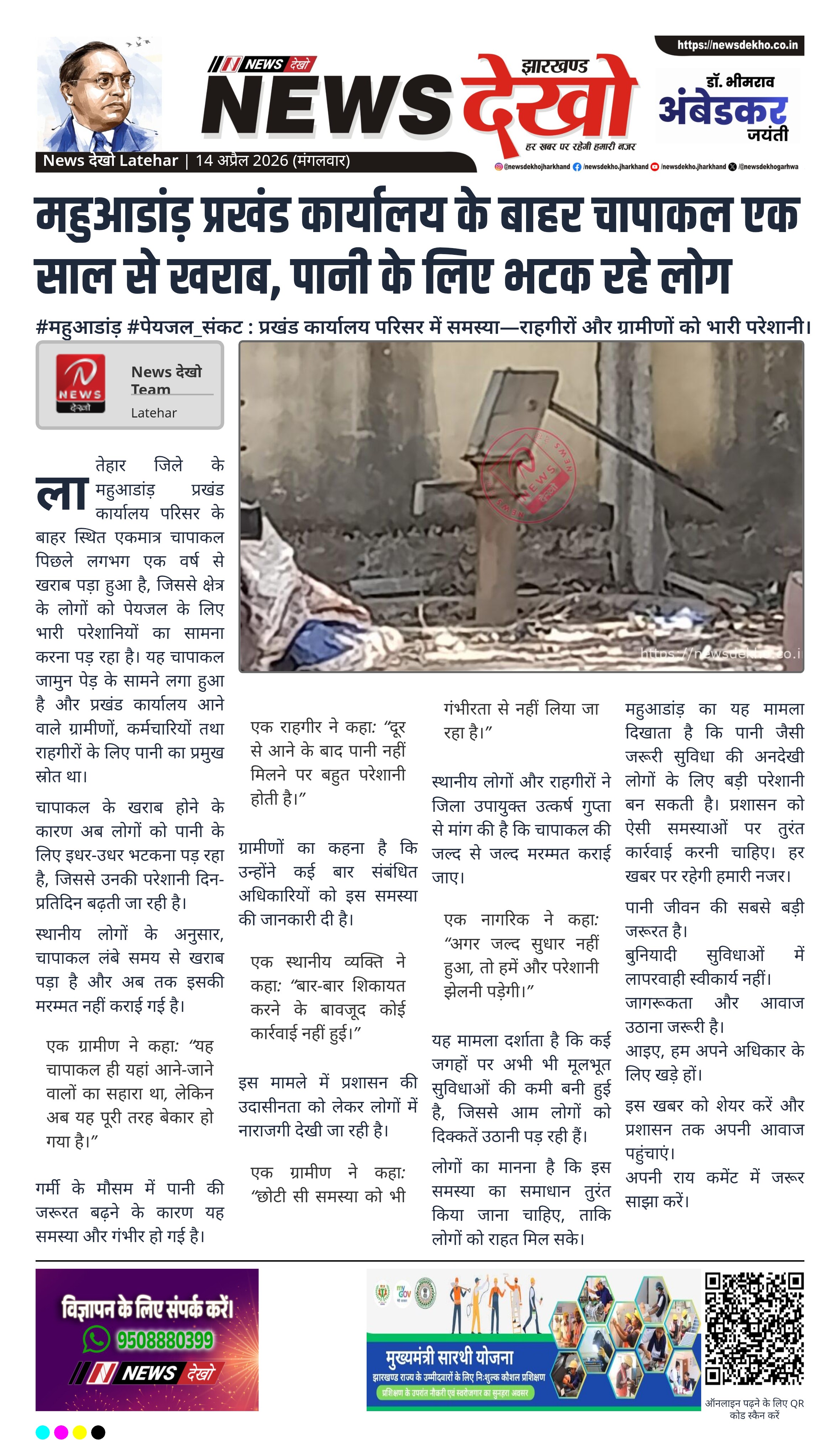 लातेहार जिले के महुआडांड़ प्रखंड कार्यालय परिसर के बाहर स्थित एकमात्र चापाकल पिछले लगभग एक वर्ष से खराब पड़ा हुआ है, जिससे क्षेत्र के लोगों को पेयजल के लिए भारी परेशानियों का सामना करना पड़ रहा है। यह चापाकल जामुन पेड़ के सामने लगा हुआ है और प्रखंड कार्यालय आने वाले ग्रामीणों, कर्मचारियों तथा राहगीरों के लिए पानी का प्रमुख स्रोत था।