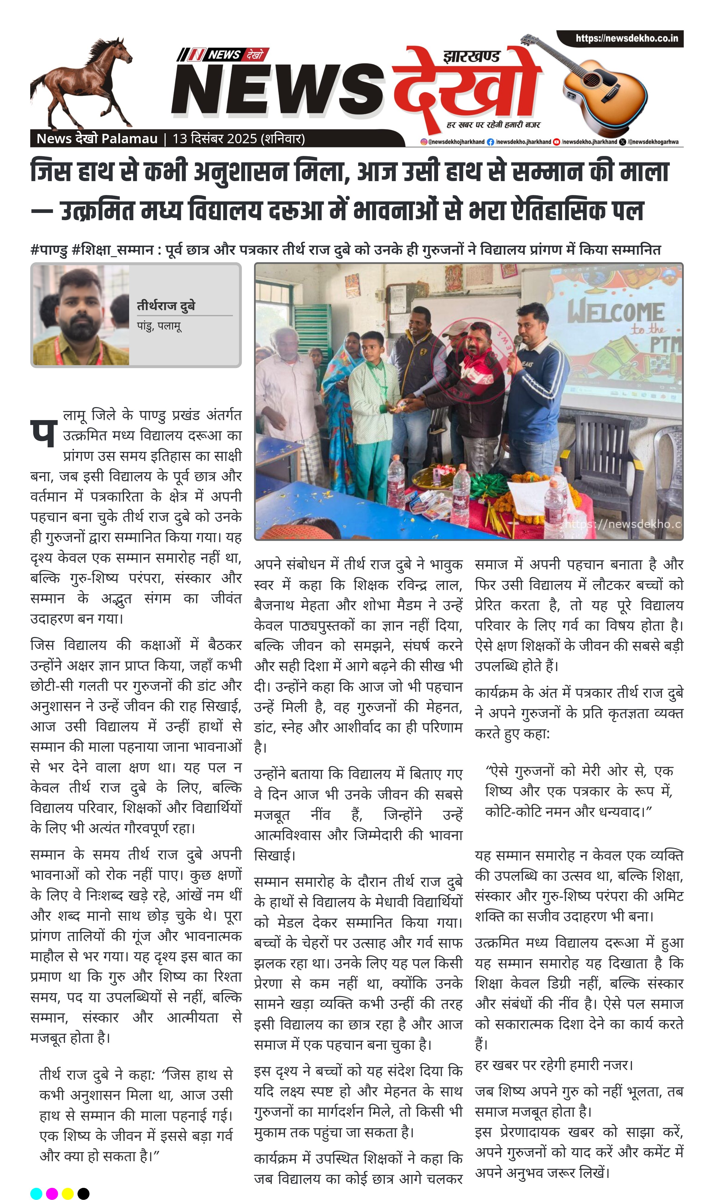 पलामू जिले के पाण्डु प्रखंड अंतर्गत उत्क्रमित मध्य विद्यालय दरूआ का प्रांगण उस समय इतिहास का साक्षी बना, जब इसी विद्यालय के पूर्व छात्र और वर्तमान में पत्रकारिता के क्षेत्र में अपनी पहचान बना चुके तीर्थ राज दुबे को उनके ही गुरुजनों द्वारा सम्मानित किया गया। यह दृश्य केवल एक सम्मान समारोह नहीं था, बल्कि गुरु-शिष्य परंपरा, संस्कार और सम्मान के अद्भुत संगम का जीवंत उदाहरण बन गया।