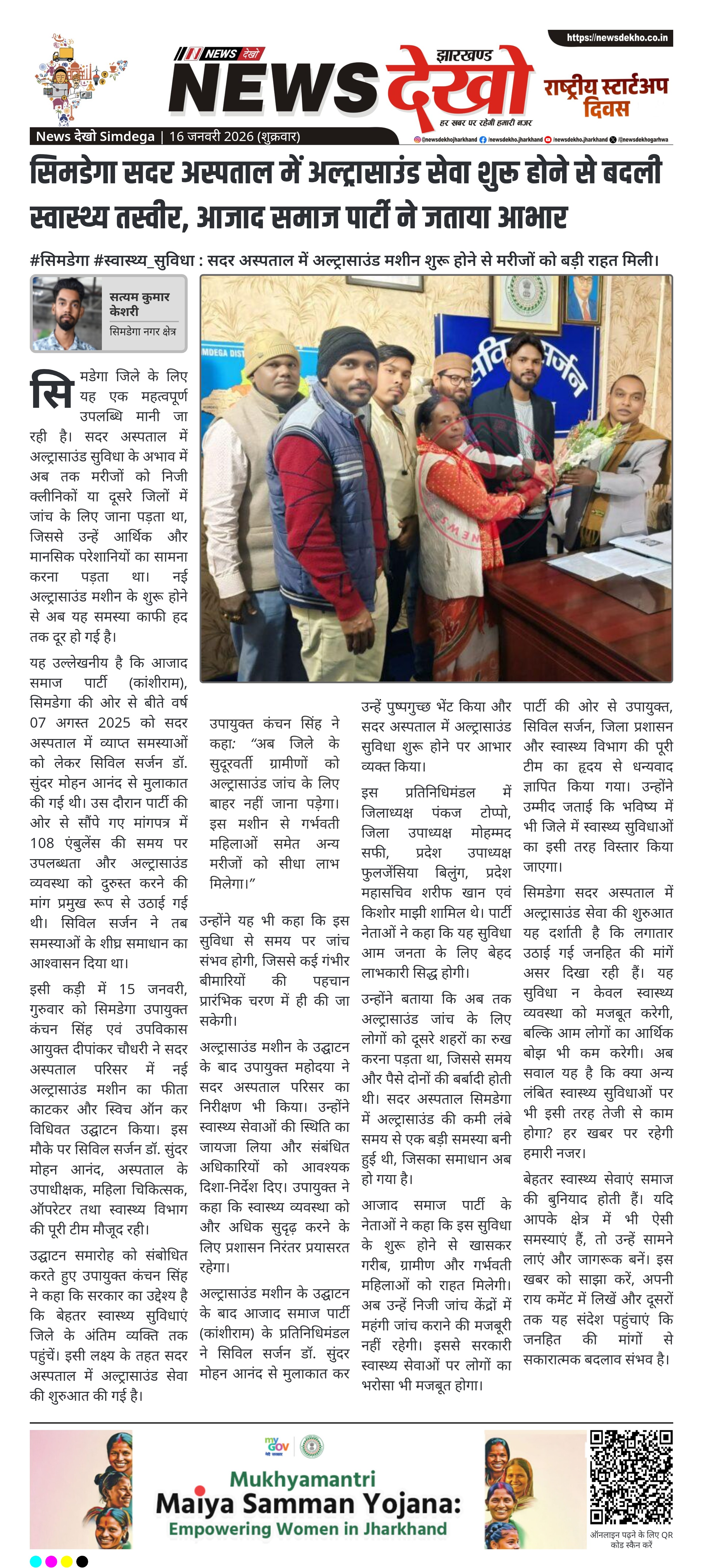 सिमडेगा सदर अस्पताल में अल्ट्रासाउंड सेवा शुरू होने से बदली स्वास्थ्य तस्वीर, आजाद समाज पार्टी ने जताया आभार