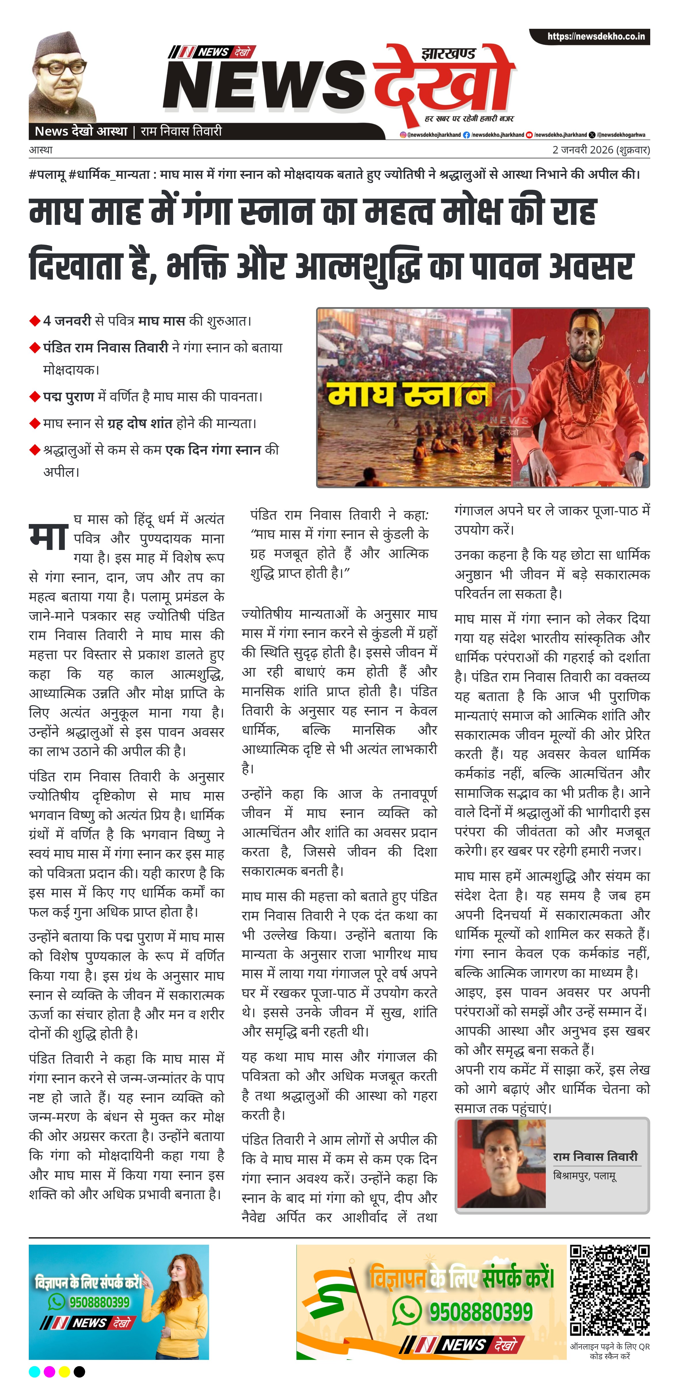 पलामू प्रमंडल के वरिष्ठ पत्रकार सह प्रसिद्ध ज्योतिषी पंडित राम निवास तिवारी ने माघ माह के धार्मिक महत्व को रेखांकित किया है। उन्होंने बताया कि 4 जनवरी से प्रारंभ हो रहे माघ मास में गंगा स्नान अत्यंत पुण्यदायक माना जाता है। ज्योतिषीय और पुराणिक मान्यताओं के अनुसार यह स्नान आत्मशुद्धि और मोक्ष प्राप्ति का मार्ग प्रशस्त करता है। श्रद्धालुओं के लिए यह आध्यात्मिक साधना का विशेष काल है।