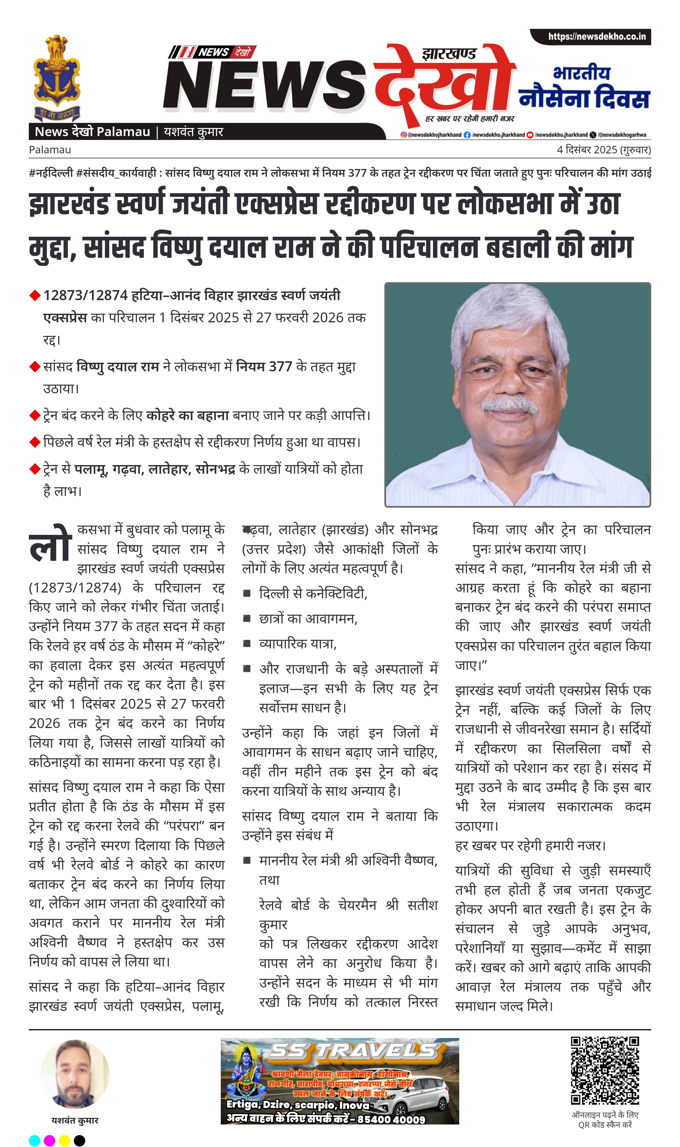 लोकसभा में बुधवार को पलामू के सांसद विष्णु दयाल राम ने झारखंड स्वर्ण जयंती एक्सप्रेस (12873/12874) के परिचालन रद्द किए जाने को लेकर गंभीर चिंता जताई। उन्होंने नियम 377 के तहत सदन में कहा कि रेलवे हर वर्ष ठंड के मौसम में “कोहरे” का हवाला देकर इस अत्यंत महत्वपूर्ण ट्रेन को महीनों तक रद्द कर देता है। इस बार भी 1 दिसंबर 2025 से 27 फरवरी 2026 तक ट्रेन बंद करने का निर्णय लिया गया है, जिससे लाखों यात्रियों को कठिनाइयों का सामना करना पड़ रहा है।