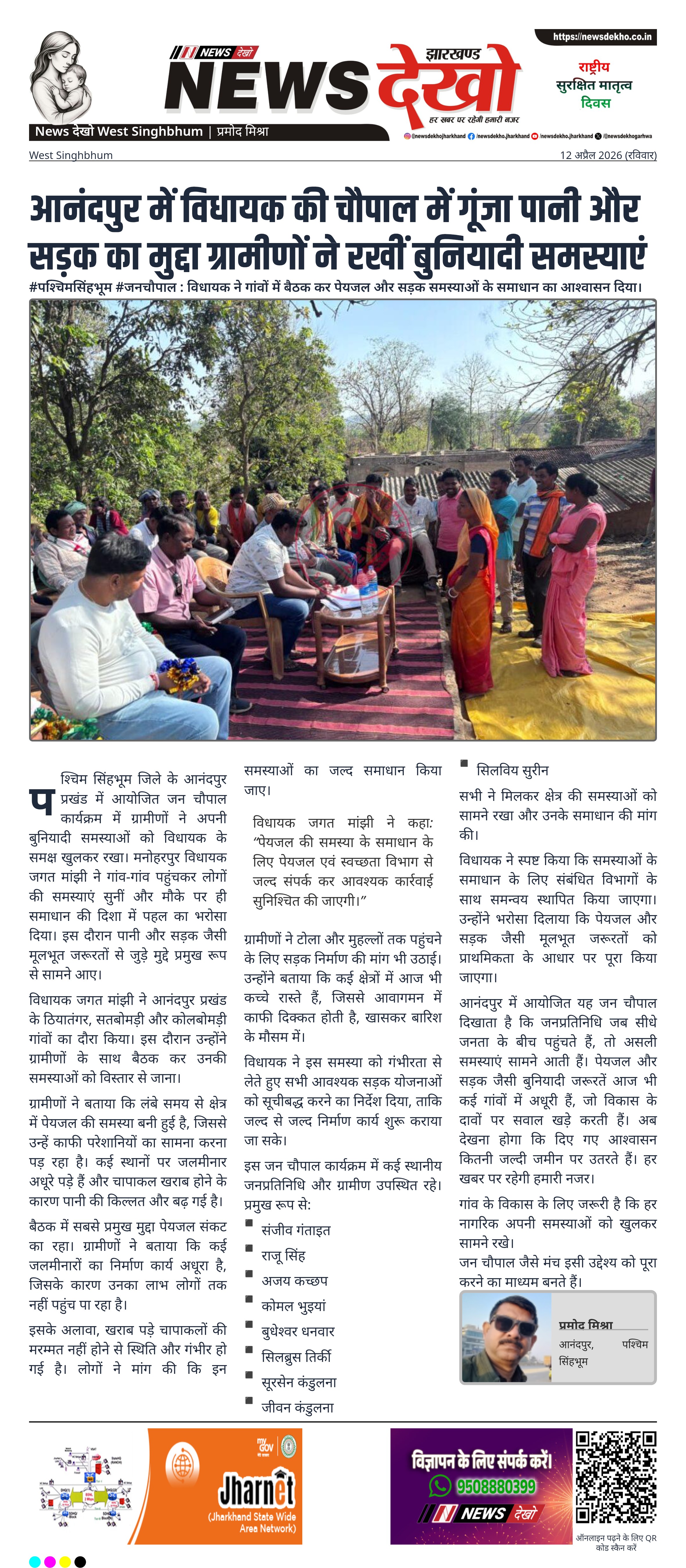 पश्चिम सिंहभूम जिले के आनंदपुर प्रखंड में आयोजित जन चौपाल कार्यक्रम में ग्रामीणों ने अपनी बुनियादी समस्याओं को विधायक के समक्ष खुलकर रखा। मनोहरपुर विधायक जगत मांझी ने गांव-गांव पहुंचकर लोगों की समस्याएं सुनीं और मौके पर ही समाधान की दिशा में पहल का भरोसा दिया। इस दौरान पानी और सड़क जैसी मूलभूत जरूरतों से जुड़े मुद्दे प्रमुख रूप से सामने आए।