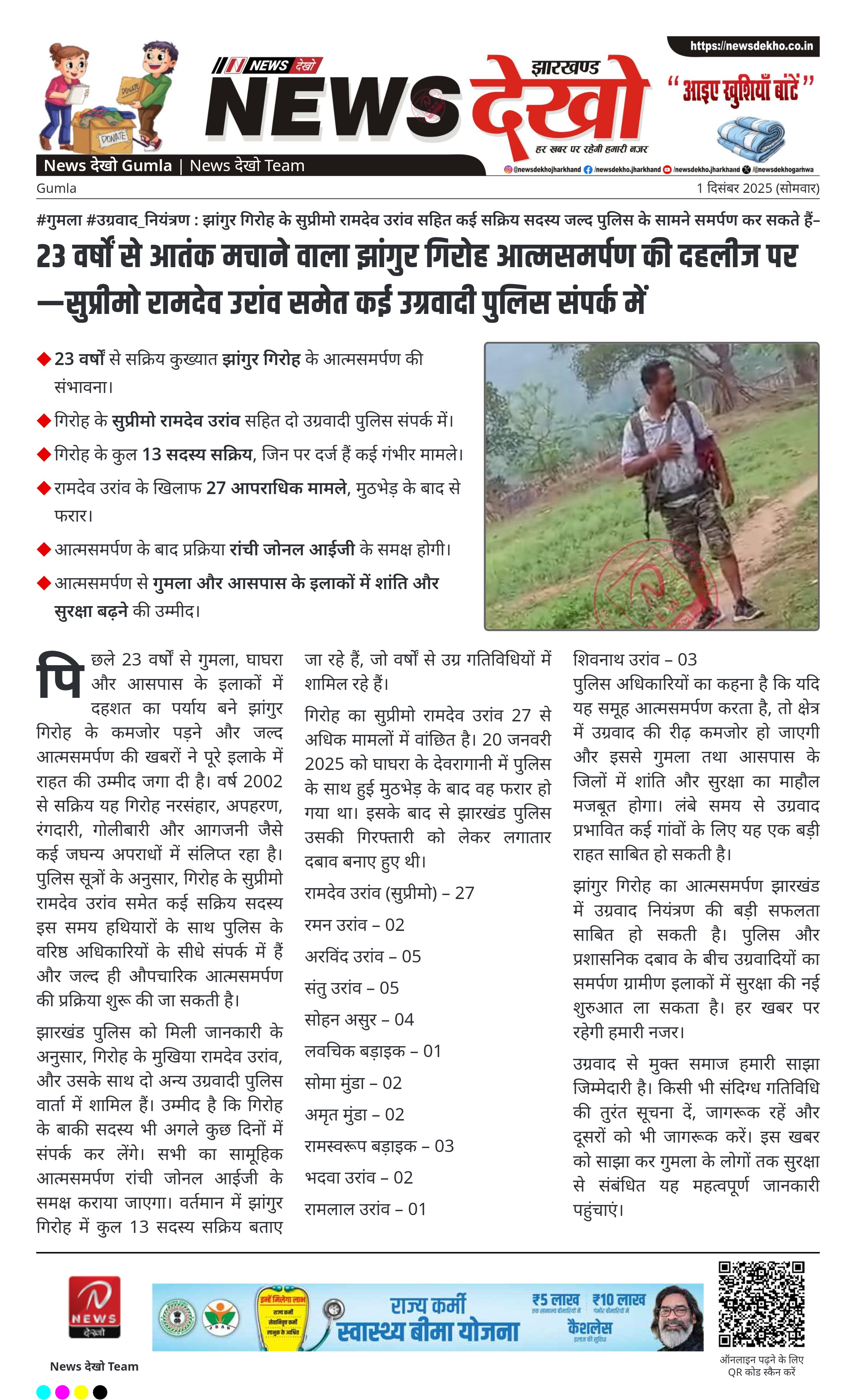 - गिरोह के सुप्रीमो रामदेव उरांव सहित दो उग्रवादी पुलिस संपर्क में।
