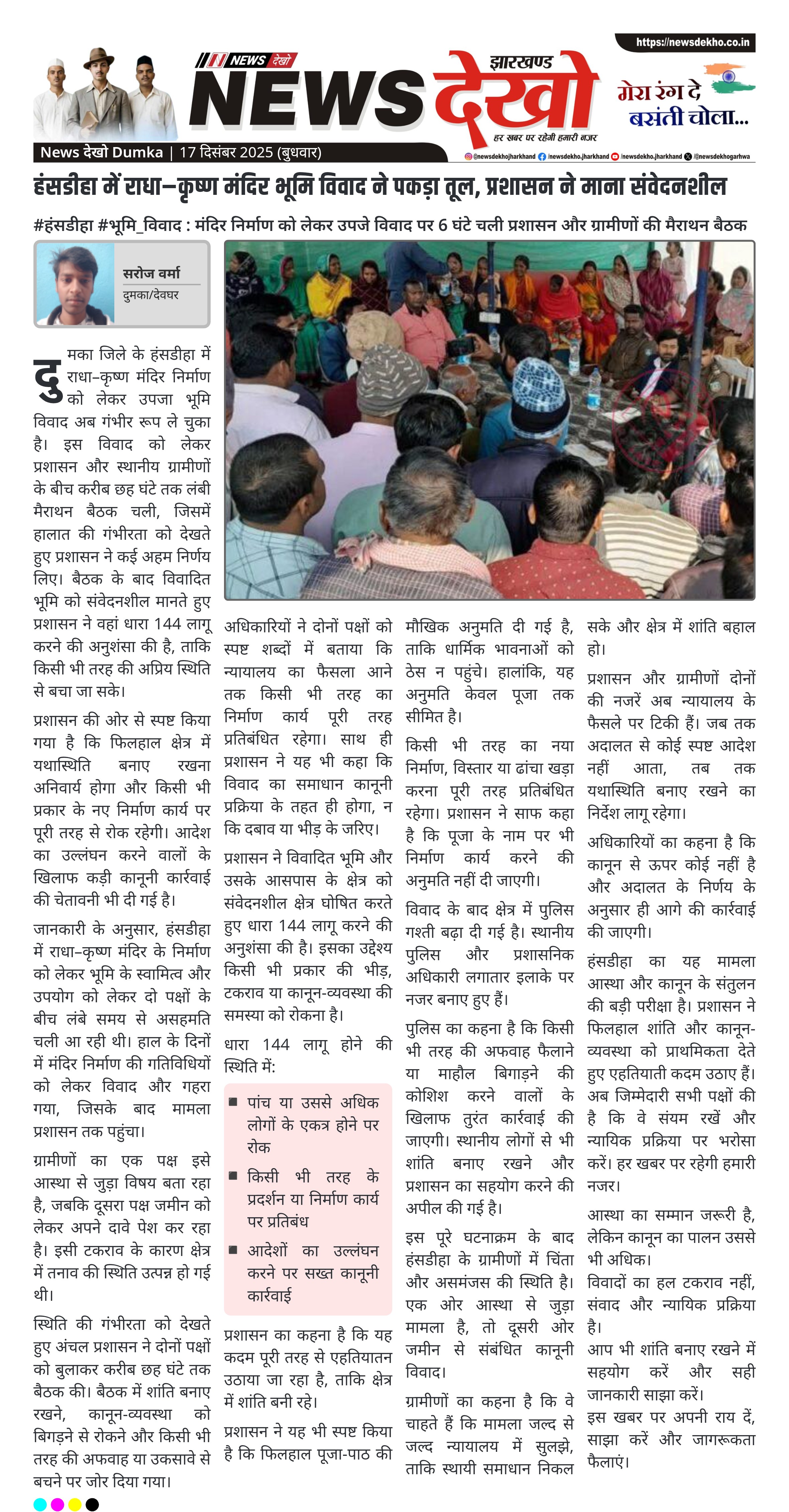 दुमका जिले के हंसडीहा में राधा–कृष्ण मंदिर निर्माण को लेकर उपजा भूमि विवाद अब गंभीर रूप ले चुका है। इस विवाद को लेकर प्रशासन और स्थानीय ग्रामीणों के बीच करीब छह घंटे तक लंबी मैराथन बैठक चली, जिसमें हालात की गंभीरता को देखते हुए प्रशासन ने कई अहम निर्णय लिए। बैठक के बाद विवादित भूमि को संवेदनशील मानते हुए प्रशासन ने वहां धारा 144 लागू करने की अनुशंसा की है, ताकि किसी भी तरह की अप्रिय स्थिति से बचा जा सके।