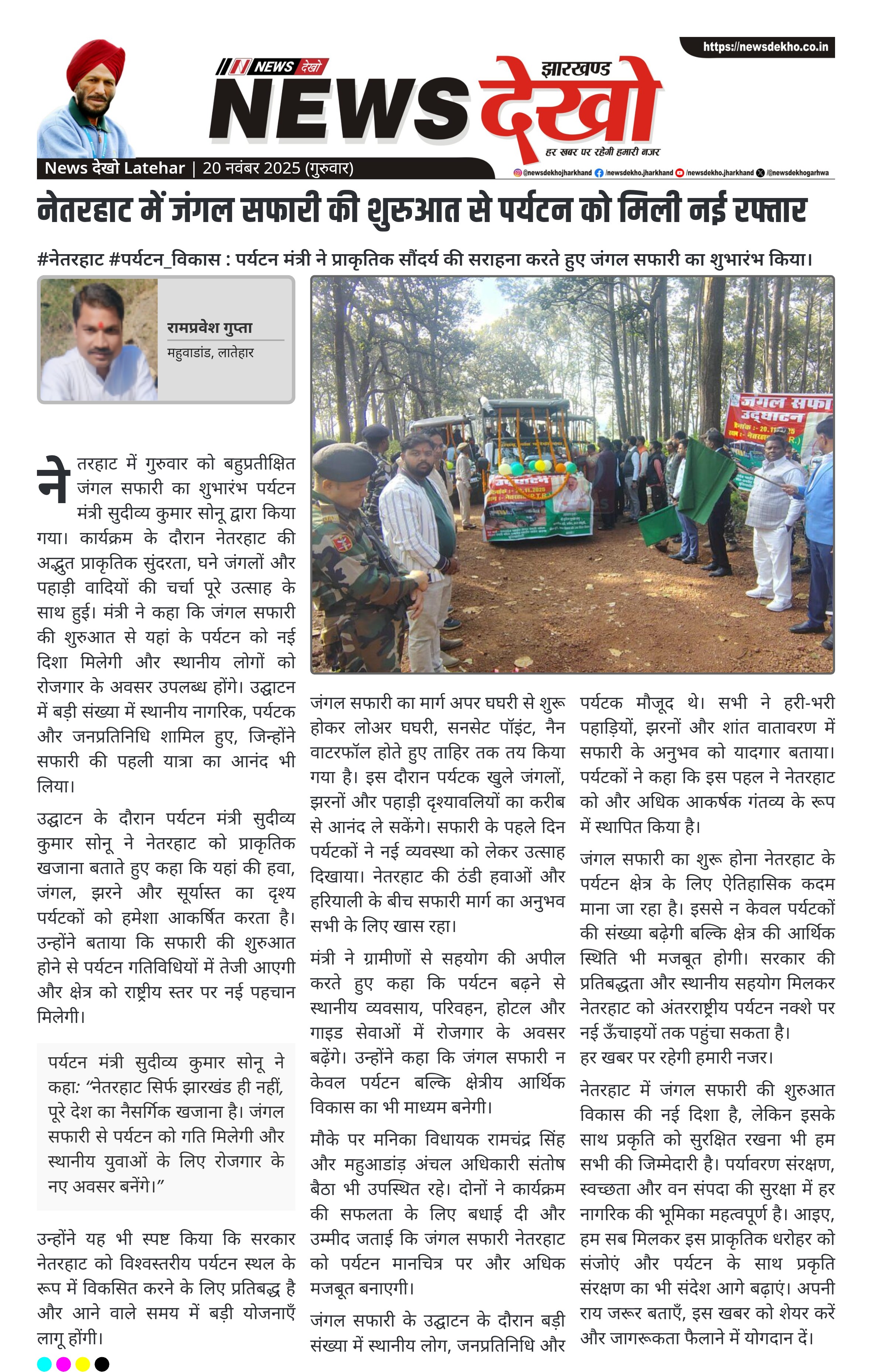 मौके पर मनिका विधायक रामचंद्र सिंह और महुआडांड़ अंचल अधिकारी संतोष बैठा भी उपस्थित रहे। दोनों ने कार्यक्रम की सफलता के लिए बधाई दी और उम्मीद जताई कि जंगल सफारी नेतरहाट को पर्यटन मानचित्र पर और अधिक मजबूत बनाएगी।