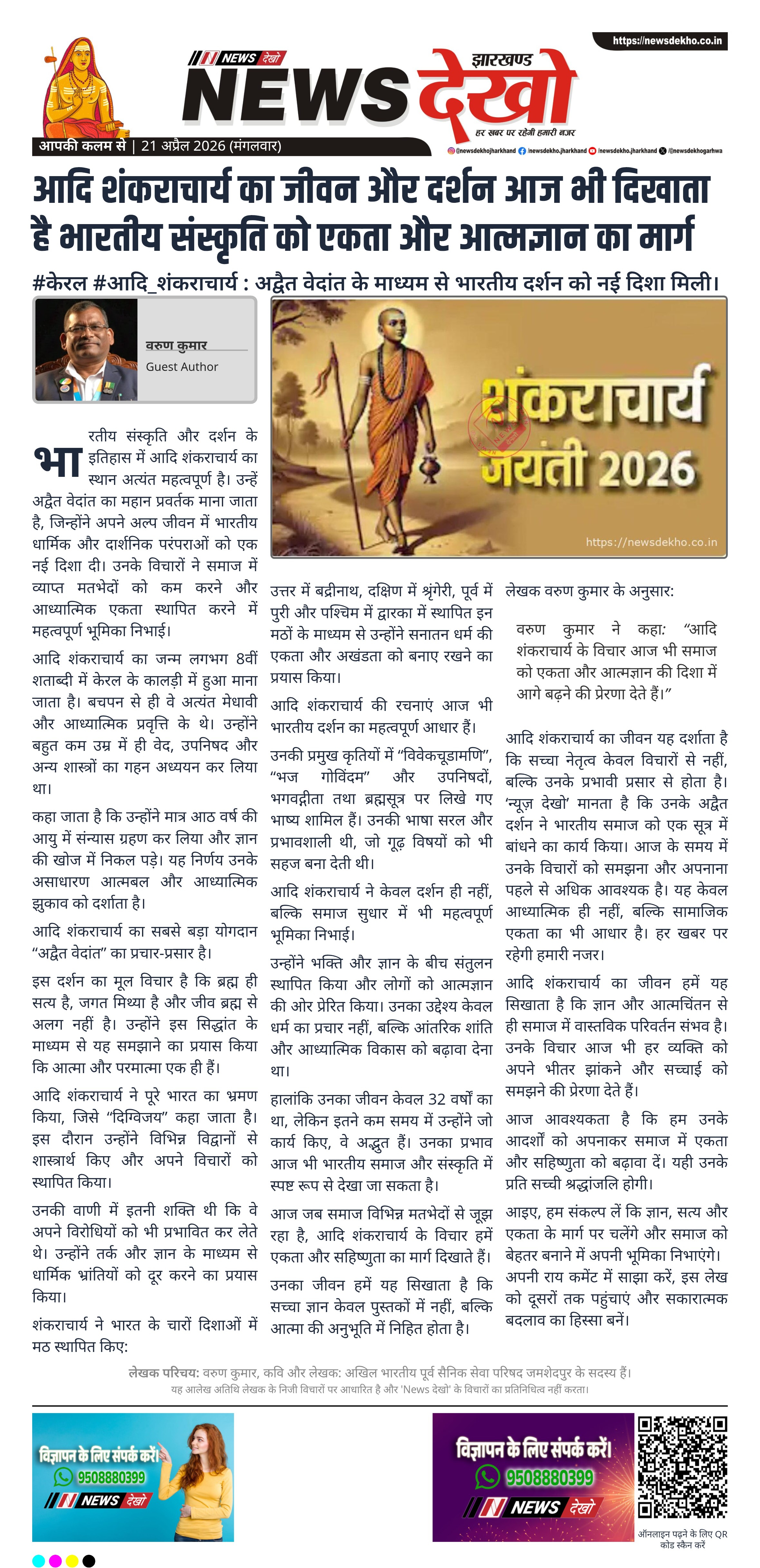 आदि शंकराचार्य का जीवन यह दर्शाता है कि सच्चा नेतृत्व केवल विचारों से नहीं, बल्कि उनके प्रभावी प्रसार से होता है। ‘न्यूज़ देखो’ मानता है कि उनके अद्वैत दर्शन ने भारतीय समाज को एक सूत्र में बांधने का कार्य किया। आज के समय में उनके विचारों को समझना और अपनाना पहले से अधिक आवश्यक है। यह केवल आध्यात्मिक ही नहीं, बल्कि सामाजिक एकता का भी आधार है। हर खबर पर रहेगी हमारी नजर।