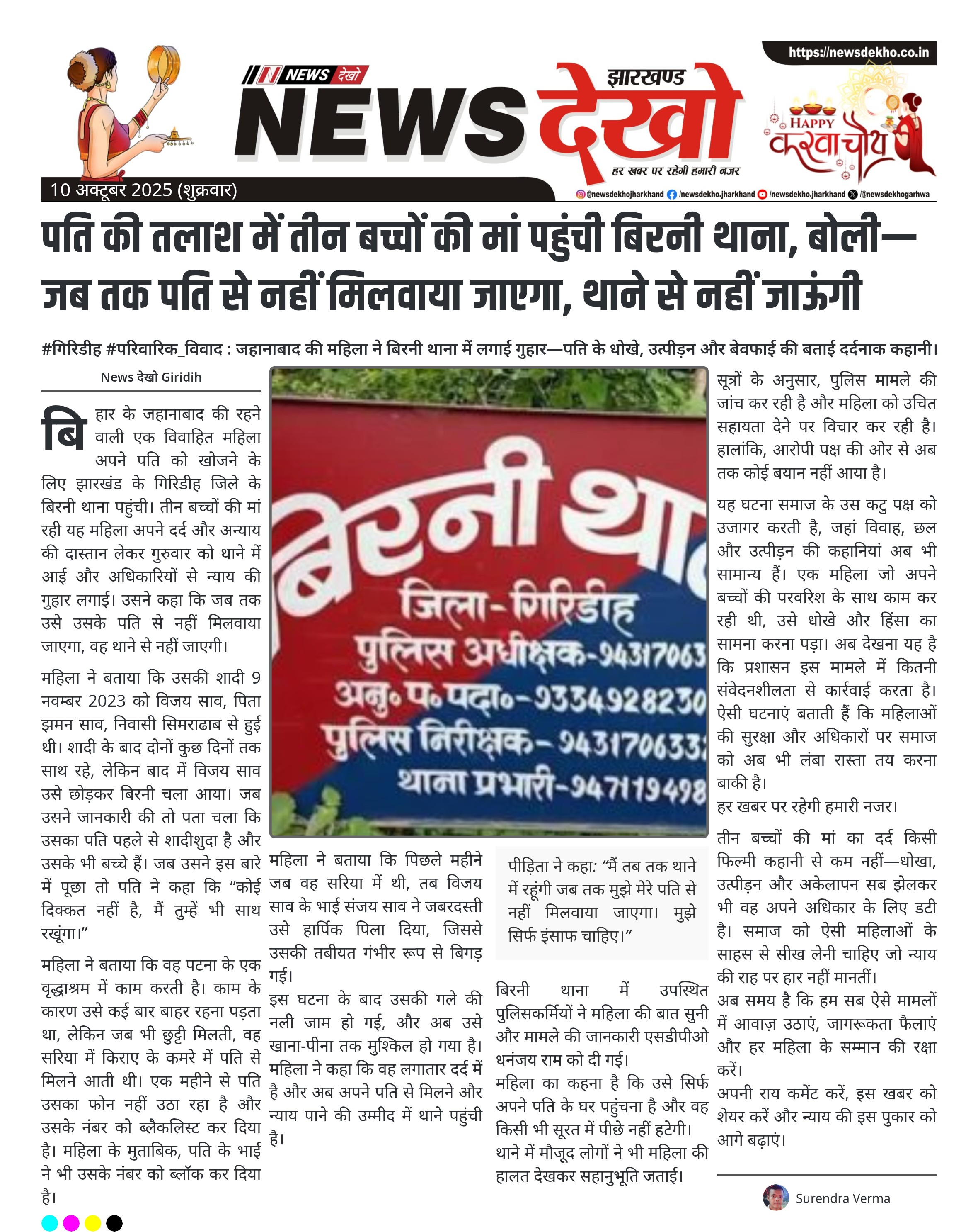 बिहार के जहानाबाद की रहने वाली एक विवाहित महिला अपने पति को खोजने के लिए झारखंड के गिरिडीह जिले के बिरनी थाना पहुंची। तीन बच्चों की मां रही यह महिला अपने दर्द और अन्याय की दास्तान लेकर गुरुवार को थाने में आई और अधिकारियों से न्याय की गुहार लगाई। उसने कहा कि जब तक उसे उसके पति से नहीं मिलवाया जाएगा, वह थाने से नहीं जाएगी।