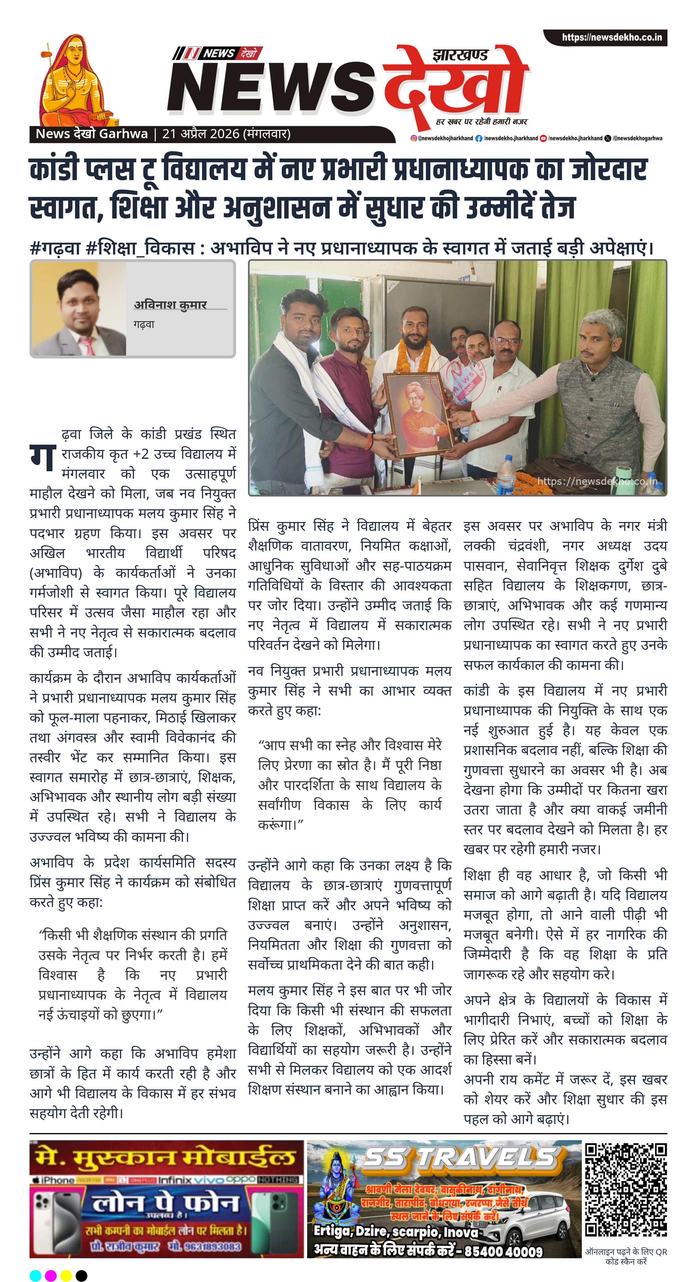 गढ़वा जिले के कांडी स्थित राजकीय कृत +2 उच्च विद्यालय में नव नियुक्त प्रभारी प्रधानाध्यापक मलय कुमार सिंह का भव्य स्वागत किया गया। इस मौके पर अभाविप कार्यकर्ताओं और स्थानीय लोगों ने विद्यालय के विकास को लेकर उम्मीद जताई। कार्यक्रम में शिक्षा की गुणवत्ता, अनुशासन और आधुनिक सुविधाओं पर जोर दिया गया। नए प्रधानाध्यापक ने विद्यालय को आदर्श संस्थान बनाने का संकल्प व्यक्त किया।