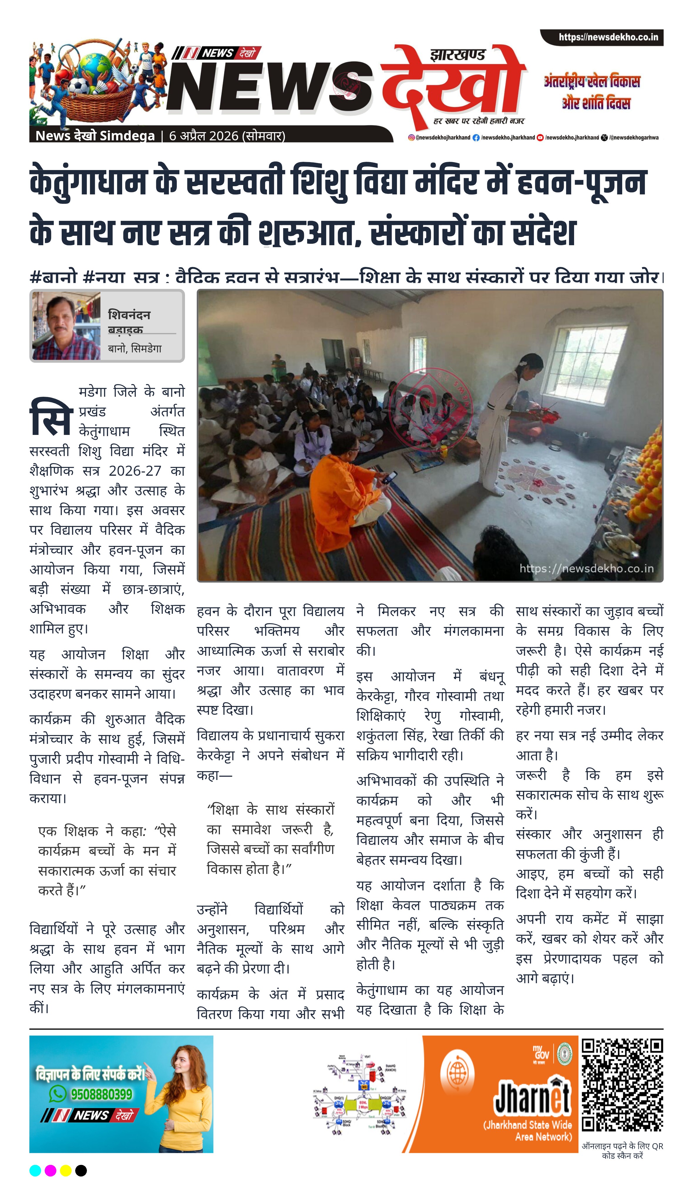 सिमडेगा जिले के बानो प्रखंड अंतर्गत केतुंगाधाम स्थित सरस्वती शिशु विद्या मंदिर में शैक्षणिक सत्र 2026-27 का शुभारंभ श्रद्धा और उत्साह के साथ किया गया। इस अवसर पर विद्यालय परिसर में वैदिक मंत्रोच्चार और हवन-पूजन का आयोजन किया गया, जिसमें बड़ी संख्या में छात्र-छात्राएं, अभिभावक और शिक्षक शामिल हुए।