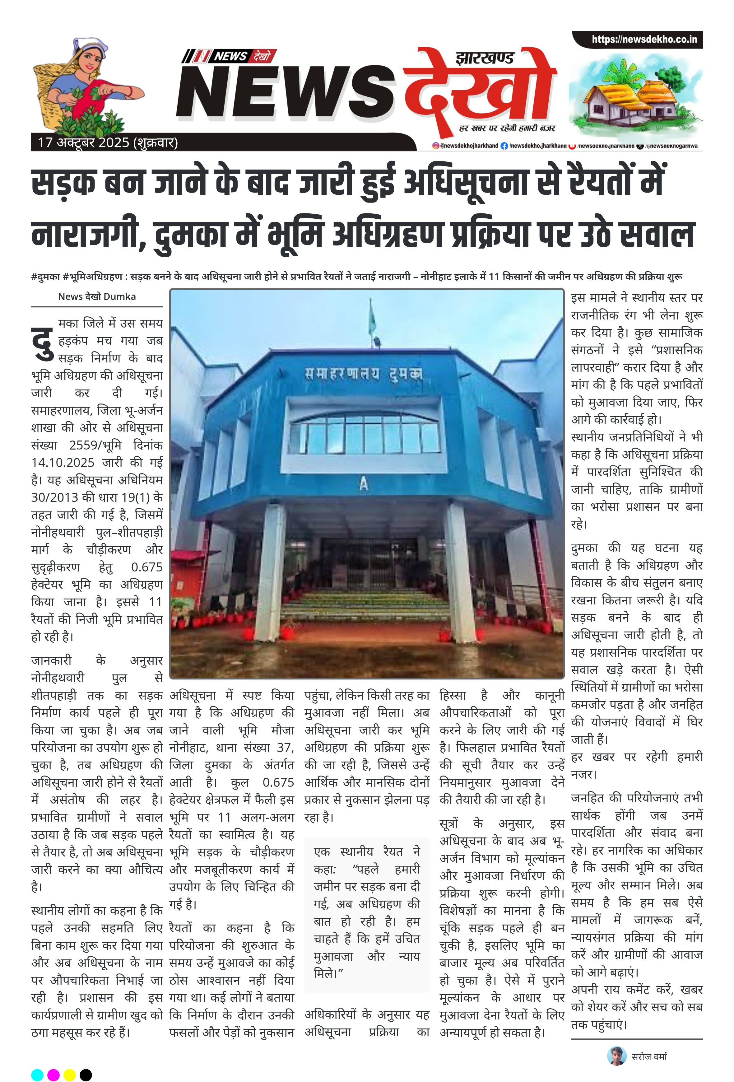 दुमका जिले में उस समय हड़कंप मच गया जब सड़क निर्माण के बाद भूमि अधिग्रहण की अधिसूचना जारी कर दी गई। समाहरणालय, जिला भू-अर्जन शाखा की ओर से अधिसूचना संख्या 2559/भूमि दिनांक 14.10.2025 जारी की गई है। यह अधिसूचना अधिनियम 30/2013 की धारा 19(1) के तहत जारी की गई है, जिसमें नोनीहथवारी पुल–शीतपहाड़ी मार्ग के चौड़ीकरण और सुदृढ़ीकरण हेतु 0.675 हेक्टेयर भूमि का अधिग्रहण किया जाना है। इससे 11 रैयतों की निजी भूमि प्रभावित हो रही है।