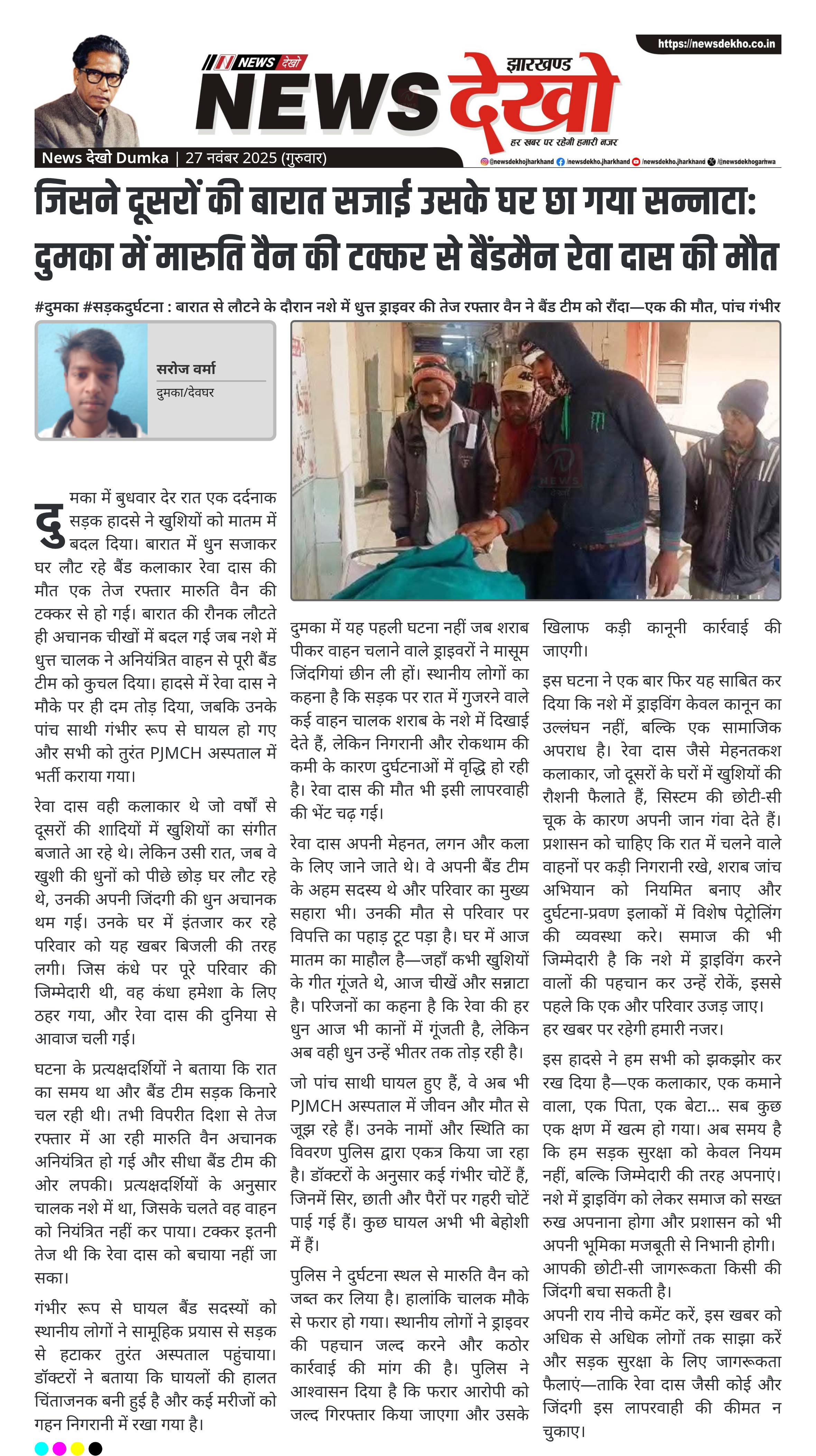 दुमका में बुधवार देर रात एक दर्दनाक सड़क हादसे ने खुशियों को मातम में बदल दिया। बारात में धुन सजाकर घर लौट रहे बैंड कलाकार रेवा दास की मौत एक तेज रफ्तार मारुति वैन की टक्कर से हो गई। बारात की रौनक लौटते ही अचानक चीखों में बदल गई जब नशे में धुत्त चालक ने अनियंत्रित वाहन से पूरी बैंड टीम को कुचल दिया। हादसे में रेवा दास ने मौके पर ही दम तोड़ दिया, जबकि उनके पांच साथी गंभीर रूप से घायल हो गए और सभी को तुरंत PJMCH अस्पताल में भर्ती कराया गया।