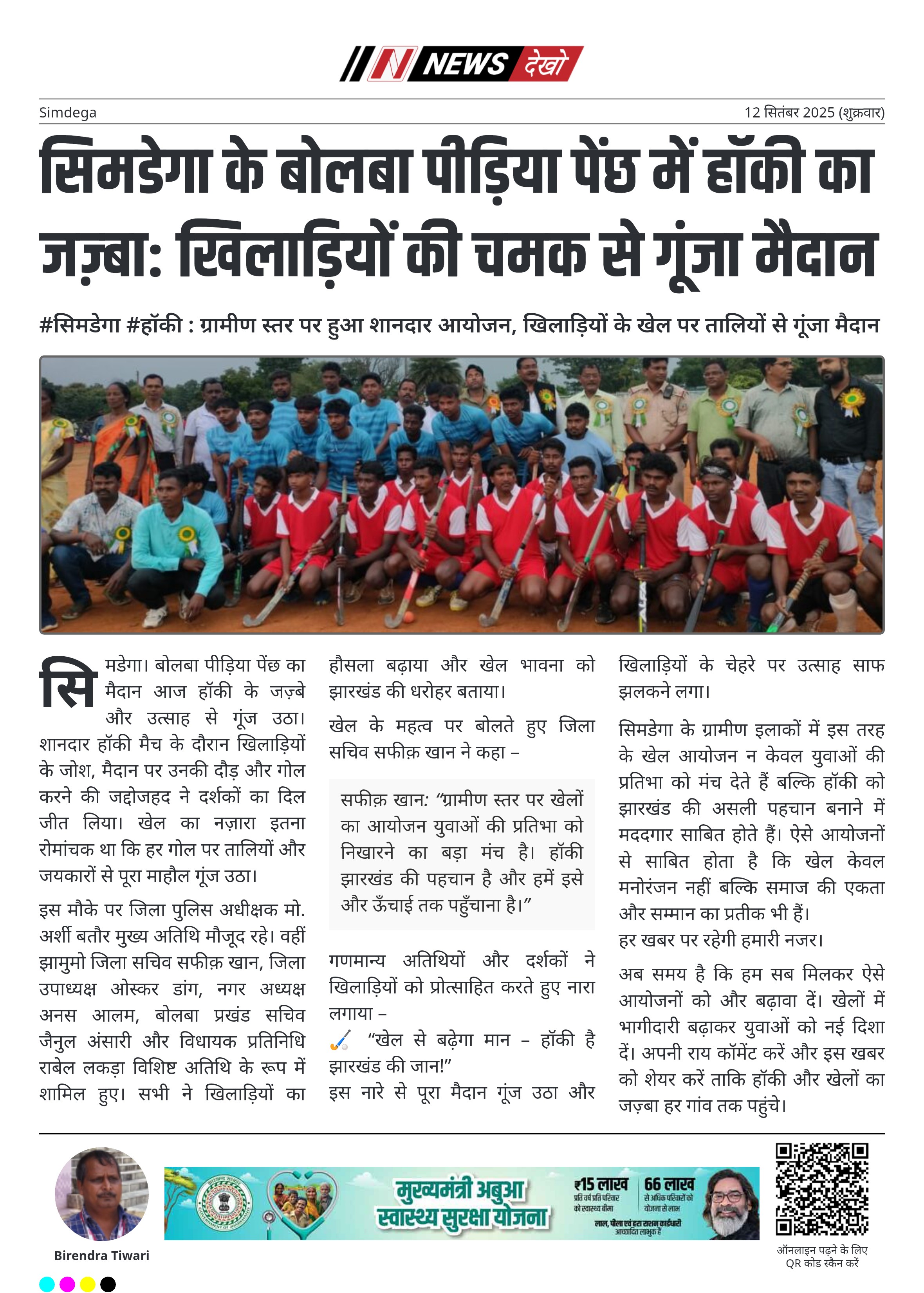 सिमडेगा। बोलबा पीड़िया पेंछ का मैदान आज हॉकी के जज़्बे और उत्साह से गूंज उठा। शानदार हॉकी मैच के दौरान खिलाड़ियों के जोश, मैदान पर उनकी दौड़ और गोल करने की जद्दोजहद ने दर्शकों का दिल जीत लिया। खेल का नज़ारा इतना रोमांचक था कि हर गोल पर तालियों और जयकारों से पूरा माहौल गूंज उठा।