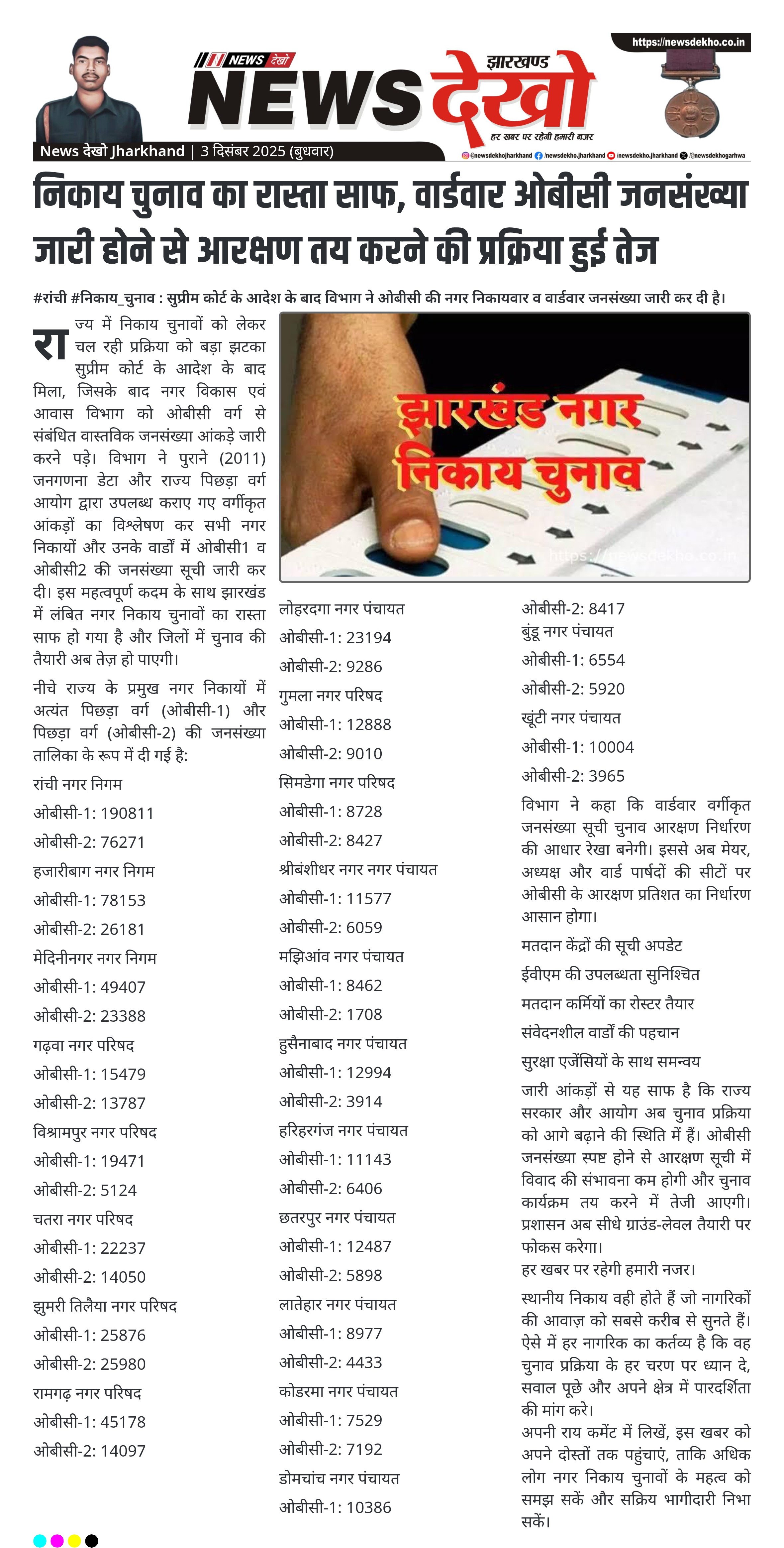राज्य में निकाय चुनावों को लेकर चल रही प्रक्रिया को बड़ा झटका सुप्रीम कोर्ट के आदेश के बाद मिला, जिसके बाद नगर विकास एवं आवास विभाग को ओबीसी वर्ग से संबंधित वास्तविक जनसंख्या आंकड़े जारी करने पड़े। विभाग ने पुराने (2011) जनगणना डेटा और राज्य पिछड़ा वर्ग आयोग द्वारा उपलब्ध कराए गए वर्गीकृत आंकड़ों का विश्लेषण कर सभी नगर निकायों और उनके वार्डों में ओबीसी1 व ओबीसी2 की जनसंख्या सूची जारी कर दी। इस महत्वपूर्ण कदम के साथ झारखंड में लंबित नगर निकाय चुनावों का रास्ता साफ हो गया है और जिलों में चुनाव की तैयारी अब तेज़ हो पाएगी।