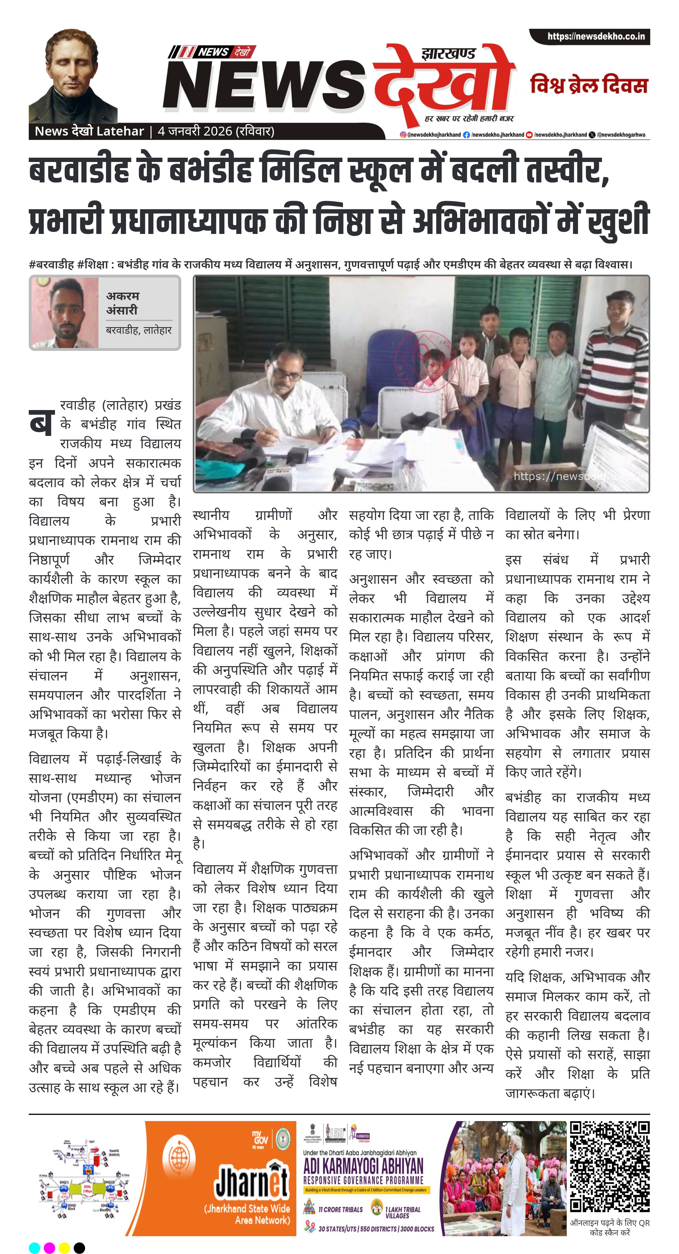 बरवाडीह (लातेहार) प्रखंड के बभंडीह गांव स्थित राजकीय मध्य विद्यालय इन दिनों अपने सकारात्मक बदलाव को लेकर क्षेत्र में चर्चा का विषय बना हुआ है। विद्यालय के प्रभारी प्रधानाध्यापक रामनाथ राम की निष्ठापूर्ण और जिम्मेदार कार्यशैली के कारण स्कूल का शैक्षणिक माहौल बेहतर हुआ है, जिसका सीधा लाभ बच्चों के साथ-साथ उनके अभिभावकों को भी मिल रहा है। विद्यालय के संचालन में अनुशासन, समयपालन और पारदर्शिता ने अभिभावकों का भरोसा फिर से मजबूत किया है।