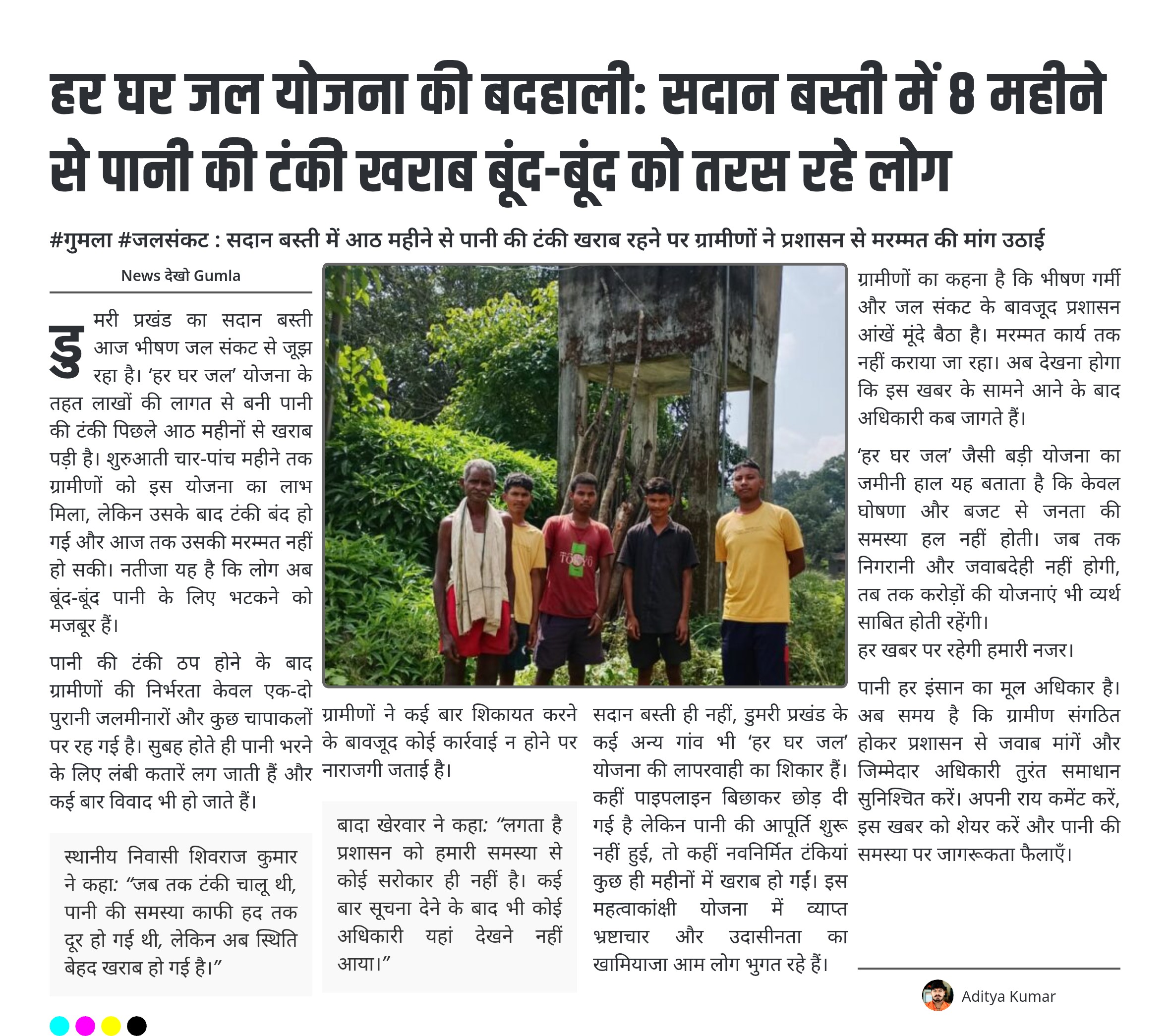 सदान बस्ती ही नहीं, डुमरी प्रखंड के कई अन्य गांव भी ‘हर घर जल’ योजना की लापरवाही का शिकार हैं। कहीं पाइपलाइन बिछाकर छोड़ दी गई है लेकिन पानी की आपूर्ति शुरू नहीं हुई, तो कहीं नवनिर्मित टंकियां कुछ ही महीनों में खराब हो गईं। इस महत्वाकांक्षी योजना में व्याप्त भ्रष्टाचार और उदासीनता का खामियाजा आम लोग भुगत रहे हैं।