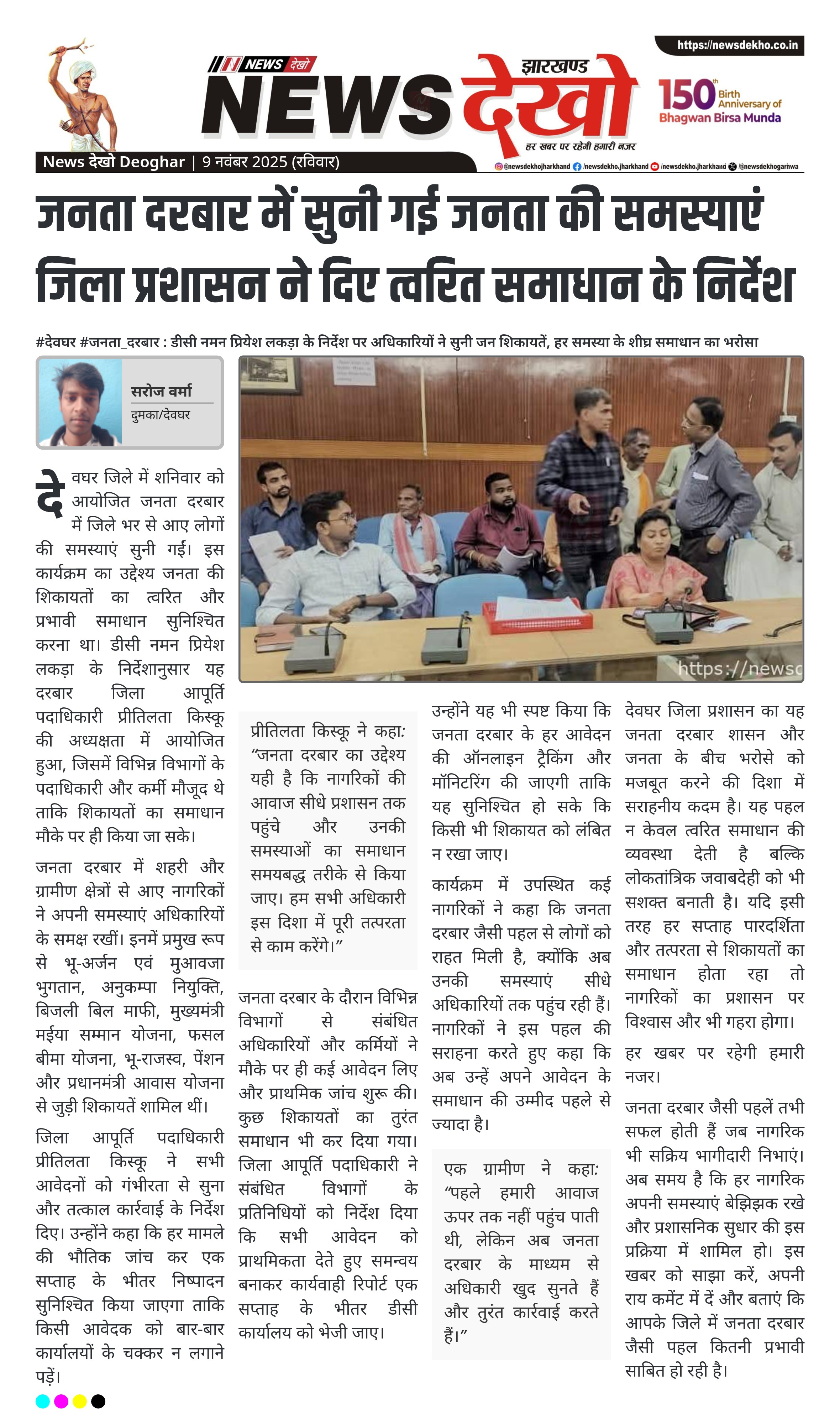 देवघर जिला प्रशासन का यह जनता दरबार शासन और जनता के बीच भरोसे को मजबूत करने की दिशा में सराहनीय कदम है। यह पहल न केवल त्वरित समाधान की व्यवस्था देती है बल्कि लोकतांत्रिक जवाबदेही को भी सशक्त बनाती है। यदि इसी तरह हर सप्ताह पारदर्शिता और तत्परता से शिकायतों का समाधान होता रहा तो नागरिकों का प्रशासन पर विश्वास और भी गहरा होगा।