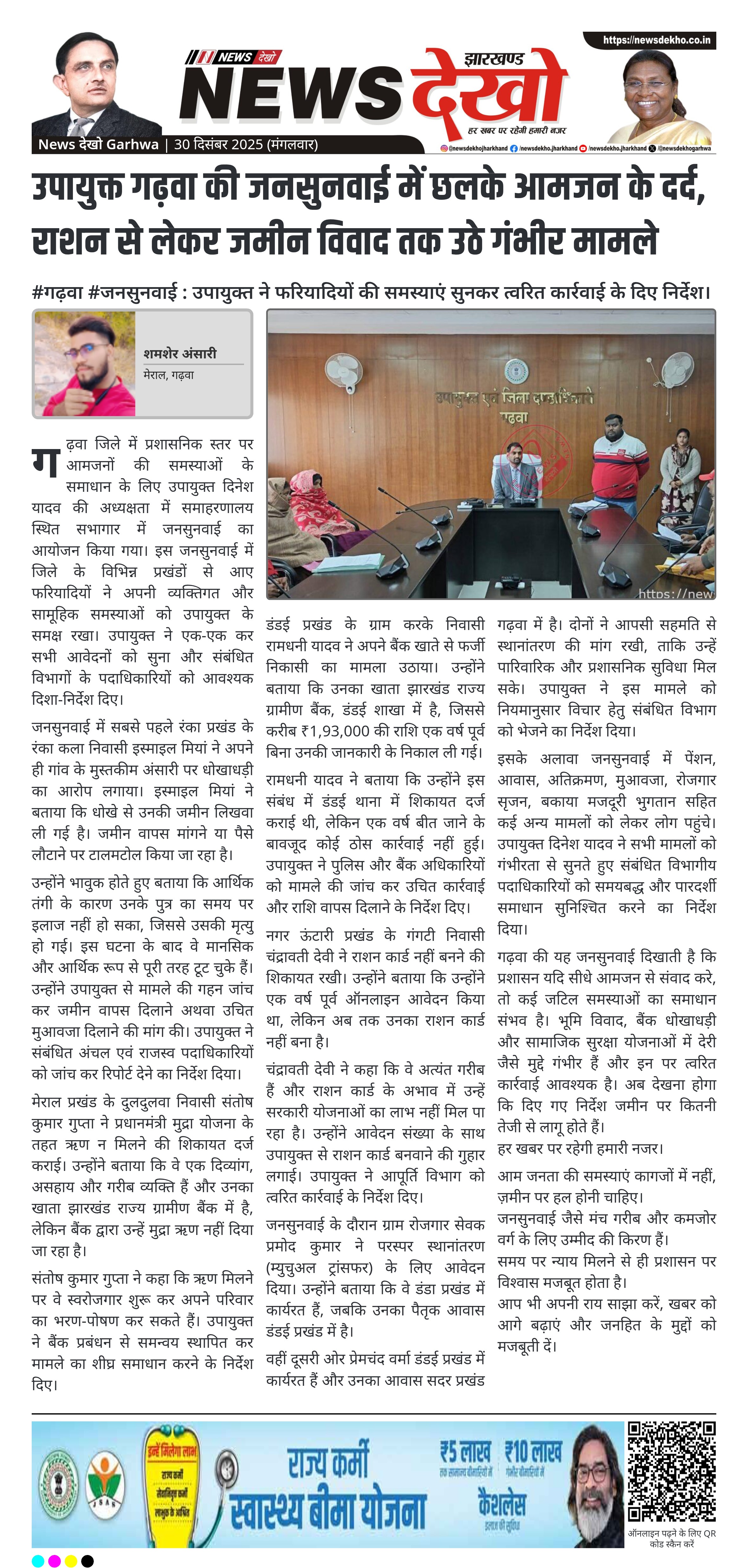 गढ़वा समाहरणालय सभागार में आयोजित जनसुनवाई कार्यक्रम में उपायुक्त दिनेश यादव ने आम नागरिकों की समस्याएं गंभीरता से सुनीं। जनसुनवाई में राशन कार्ड, पेंशन, भूमि विवाद, बैंक धोखाधड़ी, ऋण, रोजगार और मुआवजा जैसे मामलों को लेकर बड़ी संख्या में लोग पहुंचे। उपायुक्त ने प्रत्येक शिकायत पर संबंधित विभागीय पदाधिकारियों को समयबद्ध समाधान के निर्देश दिए। यह जनसुनवाई प्रशासन और आमजन के बीच सीधा संवाद स्थापित करने का सशक्त माध्यम बनी।