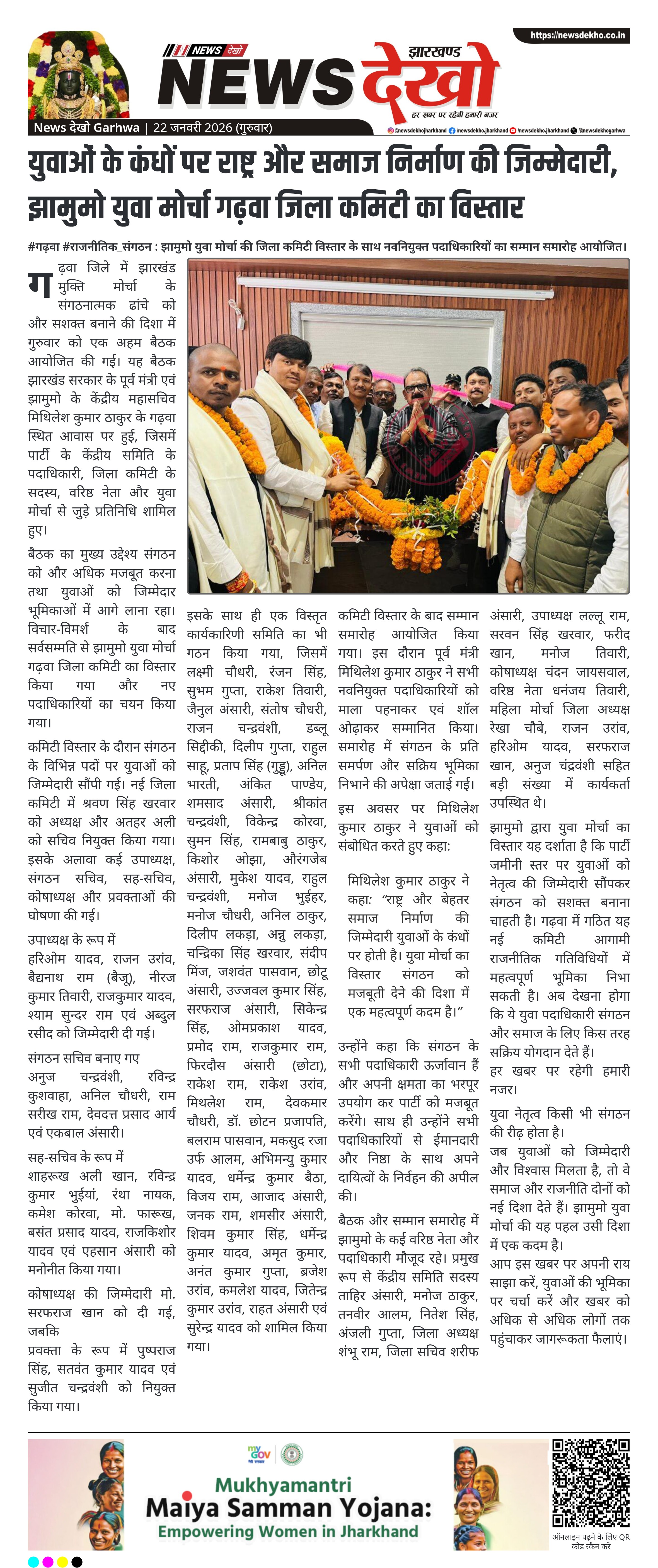 गढ़वा में झारखंड मुक्ति मोर्चा के युवा संगठन को मजबूती देने की दिशा में महत्वपूर्ण पहल की गई है। झारखंड सरकार के पूर्व मंत्री एवं झामुमो केंद्रीय महासचिव मिथिलेश कुमार ठाकुर की मौजूदगी में युवा मोर्चा जिला कमिटी का विस्तार किया गया। इस अवसर पर नवनिर्वाचित पदाधिकारियों का सम्मान समारोह भी आयोजित हुआ, जिसमें संगठनात्मक जिम्मेदारियों के साथ युवाओं की भूमिका पर विशेष जोर दिया गया। यह कार्यक्रम संगठन को जमीनी स्तर पर सशक्त करने की रणनीति का हिस्सा माना जा रहा है।