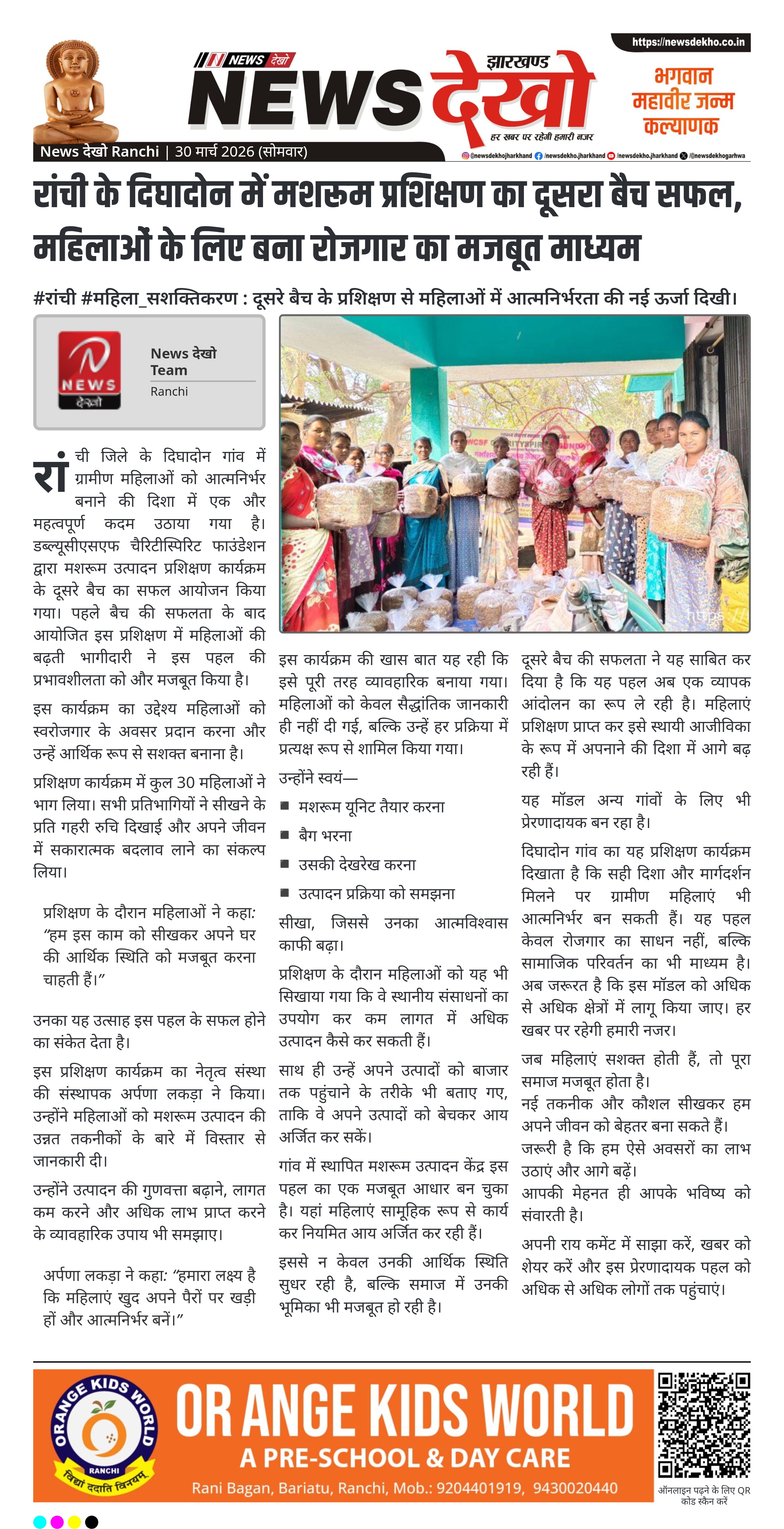 रांची के दिघादोन गांव में डब्ल्यूसीएसएफ चैरिटीस्पिरिट फाउंडेशन द्वारा मशरूम उत्पादन प्रशिक्षण का दूसरा बैच आयोजित किया गया। इसमें 30 महिलाओं ने भाग लेकर व्यावहारिक प्रशिक्षण प्राप्त किया। कार्यक्रम का उद्देश्य ग्रामीण महिलाओं को आत्मनिर्भर बनाना और आजीविका से जोड़ना है। प्रशिक्षण के बाद महिलाएं स्वरोजगार की दिशा में आगे बढ़ने के लिए तैयार हैं।
