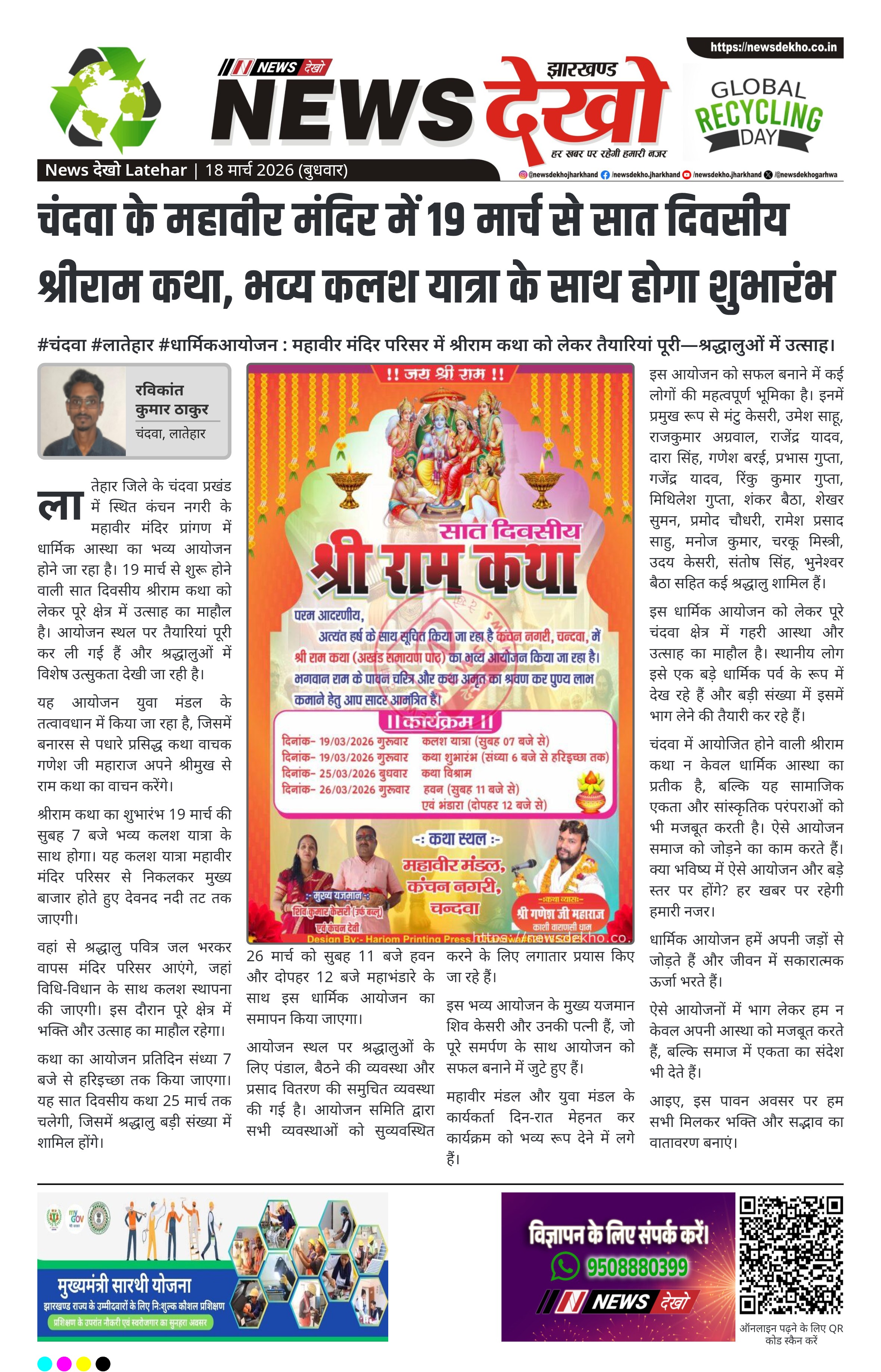 - महावीर मंदिर, चंदवा में 19 मार्च से श्रीराम कथा का आयोजन।