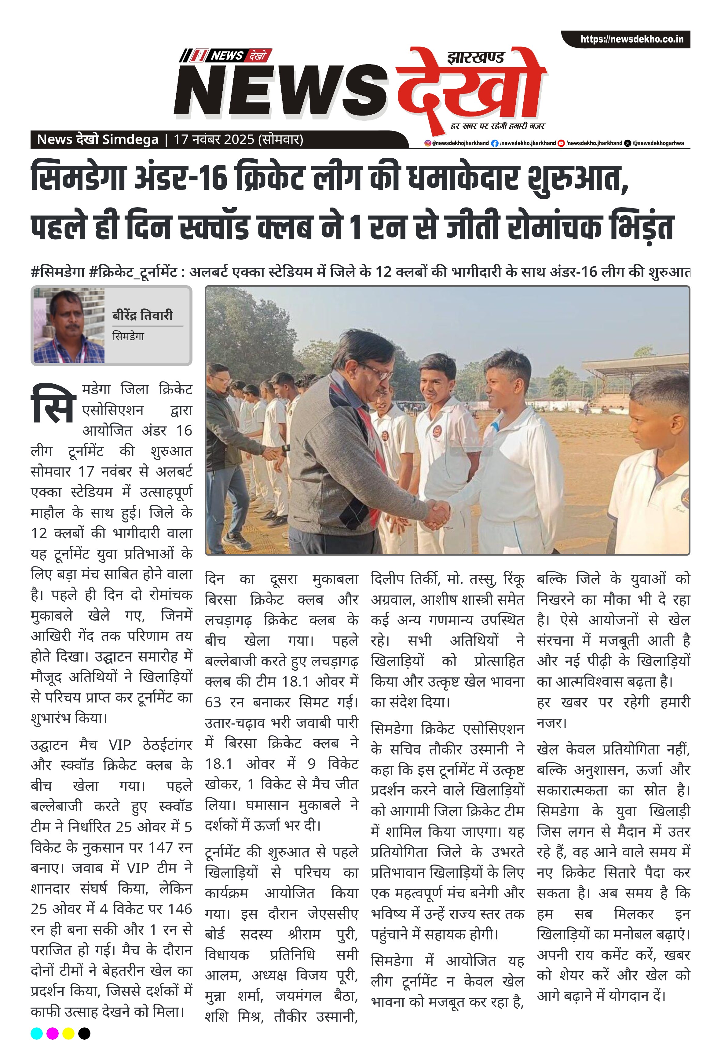 - सिमडेगा जिला क्रिकेट एसोसिएशन के तत्वावधान में अंडर-16 लीग टूर्नामेंट की शुरुआत।