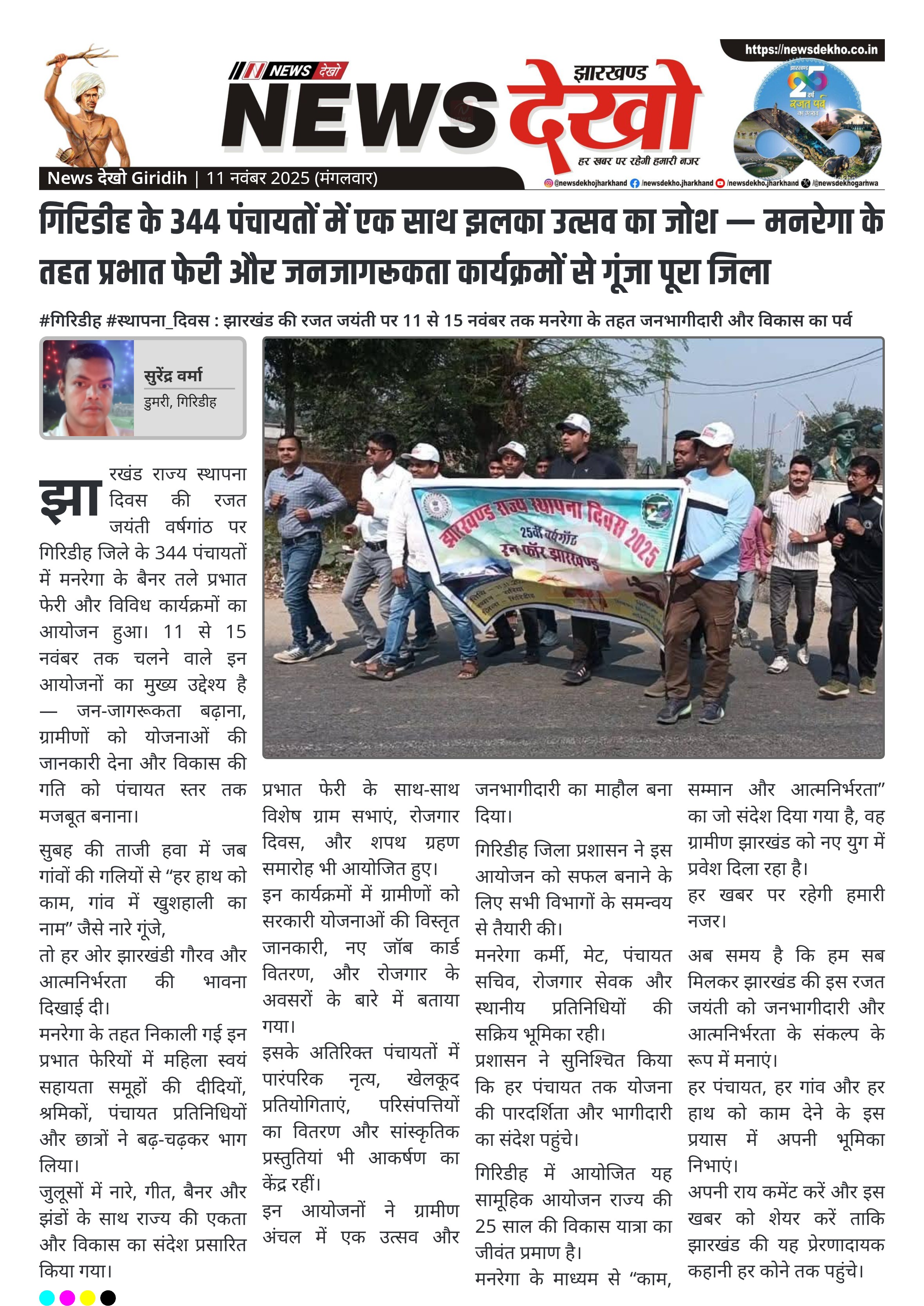 झारखंड राज्य स्थापना दिवस की रजत जयंती वर्षगांठ पर गिरिडीह जिले के 344 पंचायतों में मनरेगा के बैनर तले प्रभात फेरी और विविध कार्यक्रमों का आयोजन हुआ। 11 से 15 नवंबर तक चलने वाले इन आयोजनों का मुख्य उद्देश्य है — जन-जागरूकता बढ़ाना, ग्रामीणों को योजनाओं की जानकारी देना और विकास की गति को पंचायत स्तर तक मजबूत बनाना।