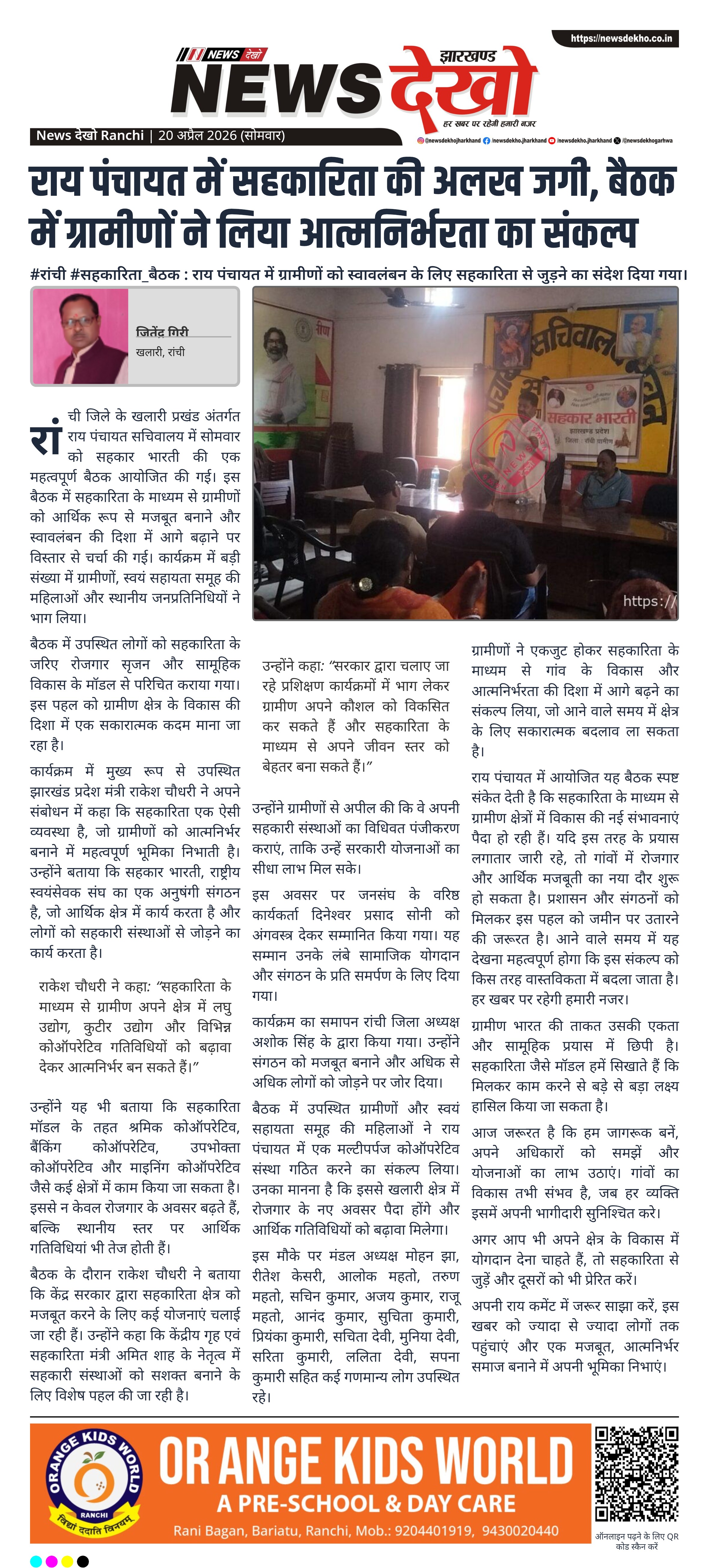 रांची जिले के खलारी प्रखंड अंतर्गत राय पंचायत सचिवालय में सोमवार को सहकार भारती की एक महत्वपूर्ण बैठक आयोजित की गई। इस बैठक में सहकारिता के माध्यम से ग्रामीणों को आर्थिक रूप से मजबूत बनाने और स्वावलंबन की दिशा में आगे बढ़ाने पर विस्तार से चर्चा की गई। कार्यक्रम में बड़ी संख्या में ग्रामीणों, स्वयं सहायता समूह की महिलाओं और स्थानीय जनप्रतिनिधियों ने भाग लिया।