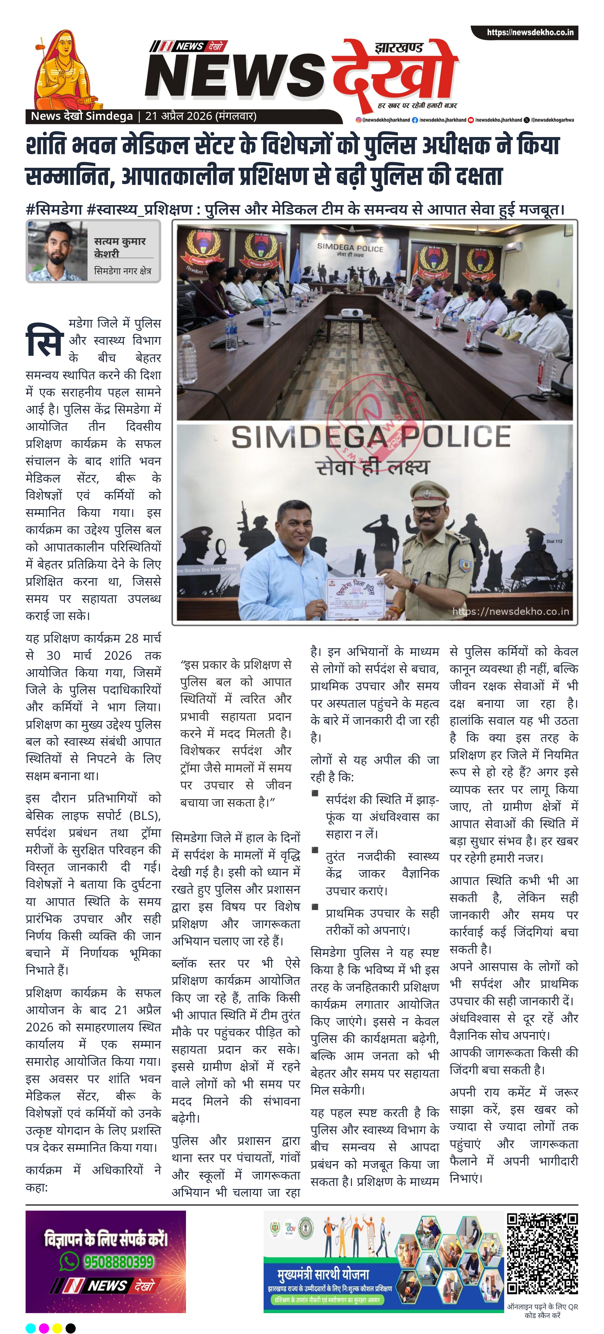 सिमडेगा जिले में पुलिस और स्वास्थ्य सेवाओं के बीच समन्वय को मजबूत करने की दिशा में एक अहम पहल देखने को मिली। तीन दिवसीय प्रशिक्षण कार्यक्रम के सफल संचालन के बाद शांति भवन मेडिकल सेंटर, बीरू के विशेषज्ञों को सम्मानित किया गया। इस प्रशिक्षण में पुलिस कर्मियों को बेसिक लाइफ सपोर्ट, सर्पदंश प्रबंधन और ट्रॉमा मरीजों के सुरक्षित परिवहन की जानकारी दी गई। यह पहल आपात स्थितियों में त्वरित और प्रभावी प्रतिक्रिया सुनिश्चित करने के लिए महत्वपूर्ण मानी जा रही है।