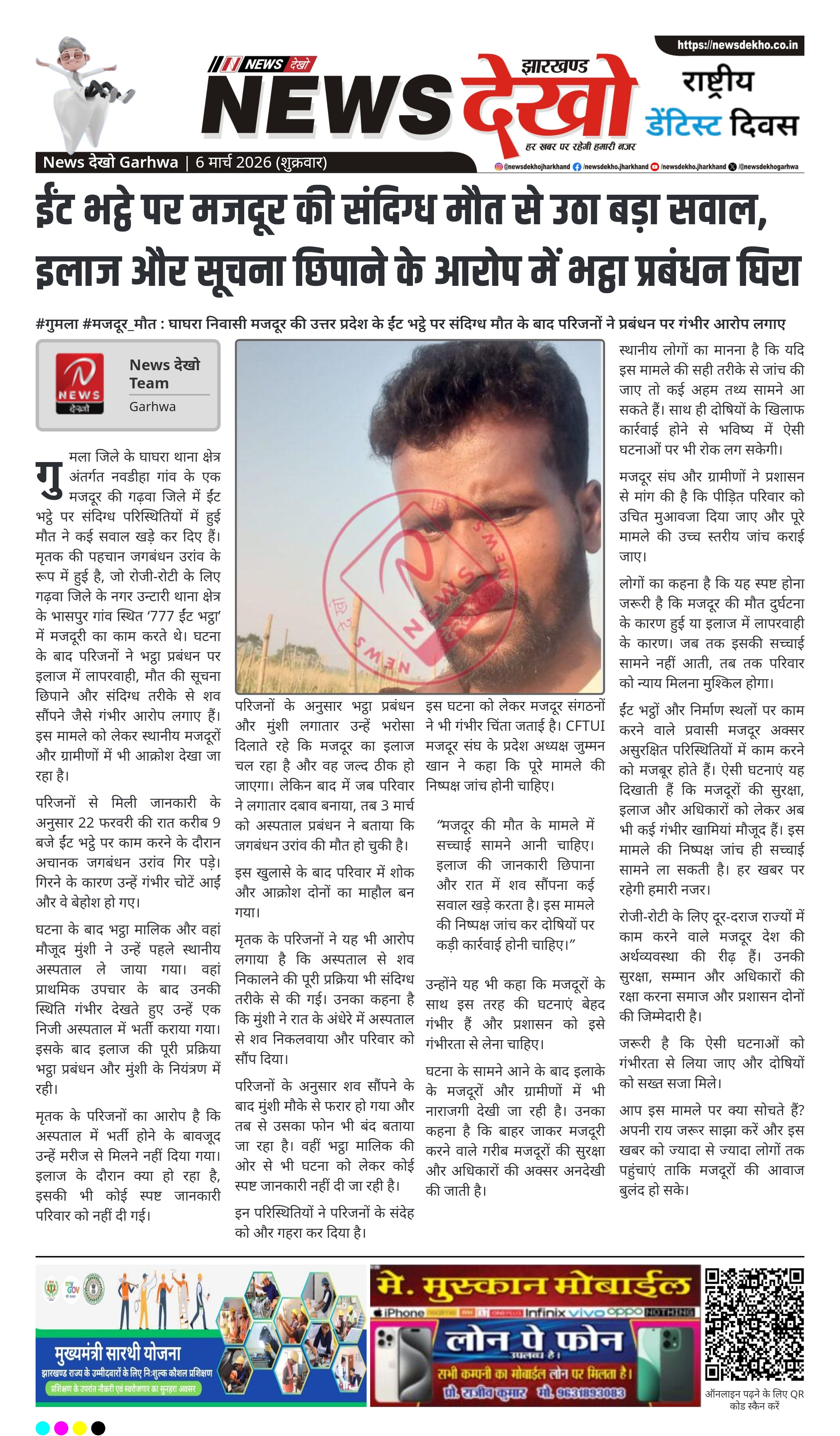 गुमला जिले के घाघरा थाना क्षेत्र अंतर्गत नवडीहा गांव के एक मजदूर की गढ़वा जिले में ईंट भट्ठे पर संदिग्ध परिस्थितियों में हुई मौत ने कई सवाल खड़े कर दिए हैं। मृतक की पहचान जगबंधन उरांव के रूप में हुई है, जो रोजी-रोटी के लिए गढ़वा जिले के नगर उन्टारी थाना क्षेत्र के भासपुर गांव स्थित ‘777 ईंट भट्ठा’ में मजदूरी का काम करते थे। घटना के बाद परिजनों ने भट्ठा प्रबंधन पर इलाज में लापरवाही, मौत की सूचना छिपाने और संदिग्ध तरीके से शव सौंपने जैसे गंभीर आरोप लगाए हैं। इस मामले को लेकर स्थानीय मजदूरों और ग्रामीणों में भी आक्रोश देखा जा रहा है।