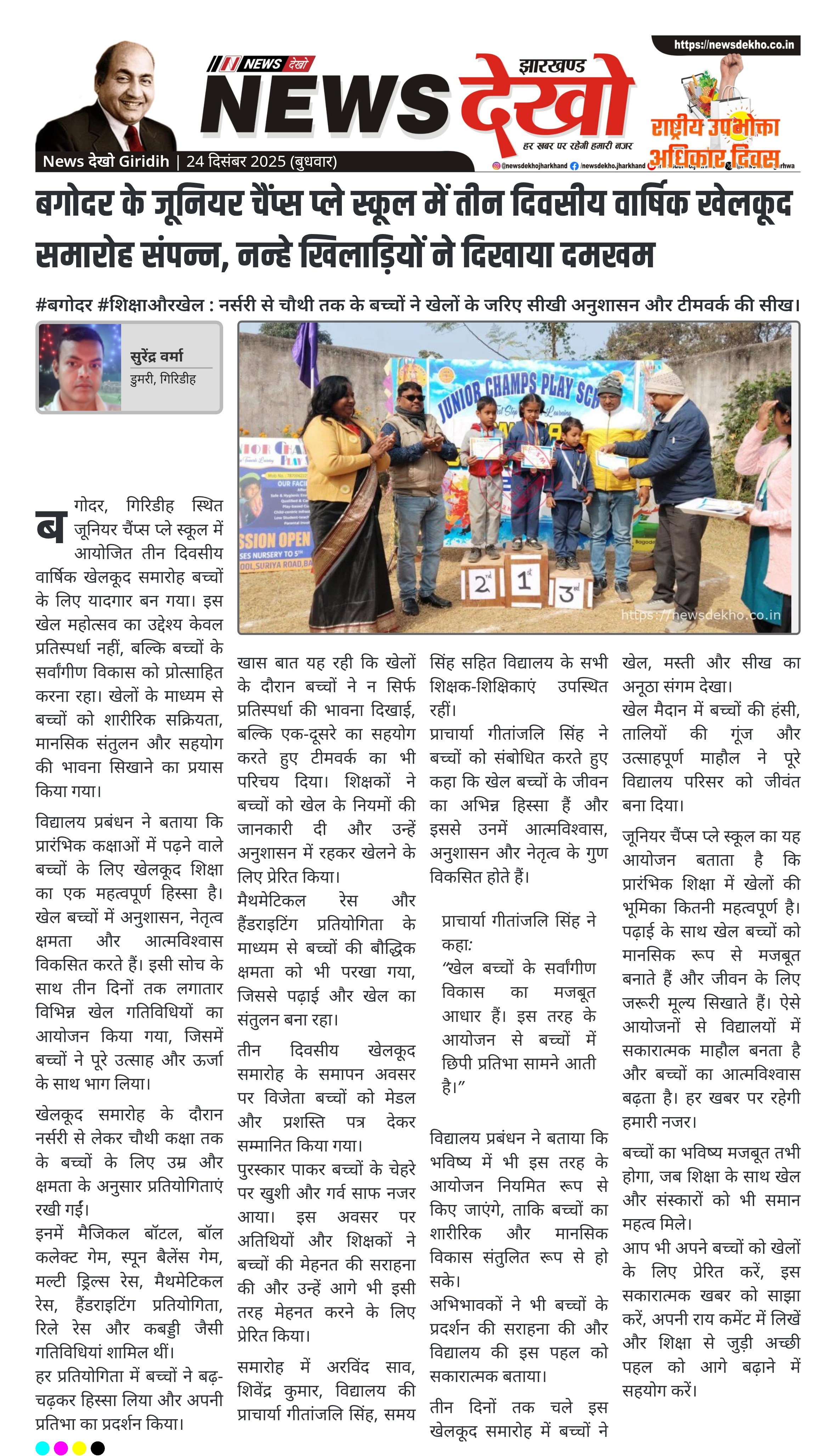 बगोदर, गिरिडीह स्थित जूनियर चैंप्स प्ले स्कूल में आयोजित तीन दिवसीय वार्षिक खेलकूद समारोह बच्चों के लिए यादगार बन गया। इस खेल महोत्सव का उद्देश्य केवल प्रतिस्पर्धा नहीं, बल्कि बच्चों के सर्वांगीण विकास को प्रोत्साहित करना रहा। खेलों के माध्यम से बच्चों को शारीरिक सक्रियता, मानसिक संतुलन और सहयोग की भावना सिखाने का प्रयास किया गया।