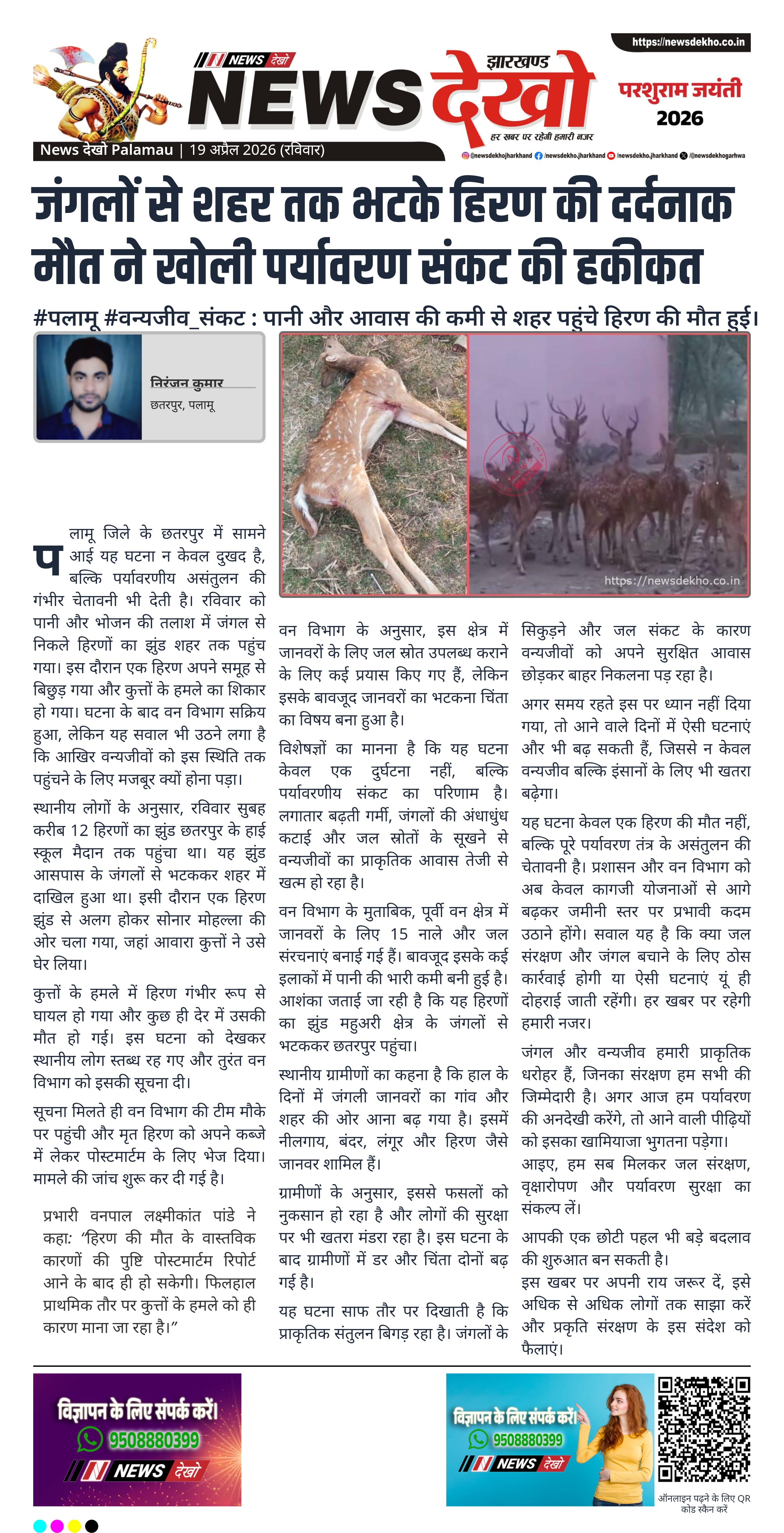 पलामू जिले के छतरपुर में सामने आई यह घटना न केवल दुखद है, बल्कि पर्यावरणीय असंतुलन की गंभीर चेतावनी भी देती है। रविवार को पानी और भोजन की तलाश में जंगल से निकले हिरणों का झुंड शहर तक पहुंच गया। इस दौरान एक हिरण अपने समूह से बिछुड़ गया और कुत्तों के हमले का शिकार हो गया। घटना के बाद वन विभाग सक्रिय हुआ, लेकिन यह सवाल भी उठने लगा है कि आखिर वन्यजीवों को इस स्थिति तक पहुंचने के लिए मजबूर क्यों होना पड़ा।