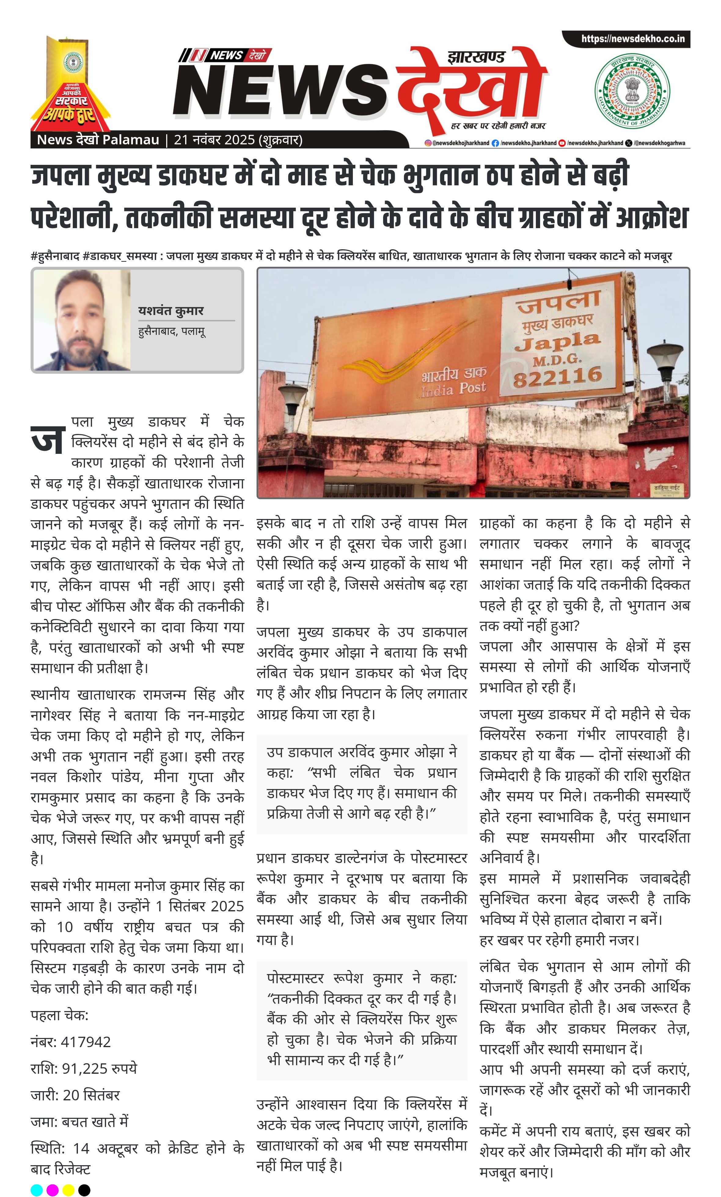 #हुसैनाबाद #डाकघर_समस्या : जपला मुख्य डाकघर में दो महीने से चेक क्लियरेंस बाधित, खाताधारक भुगतान के लिए रोजाना चक्कर काटने को मजबूर