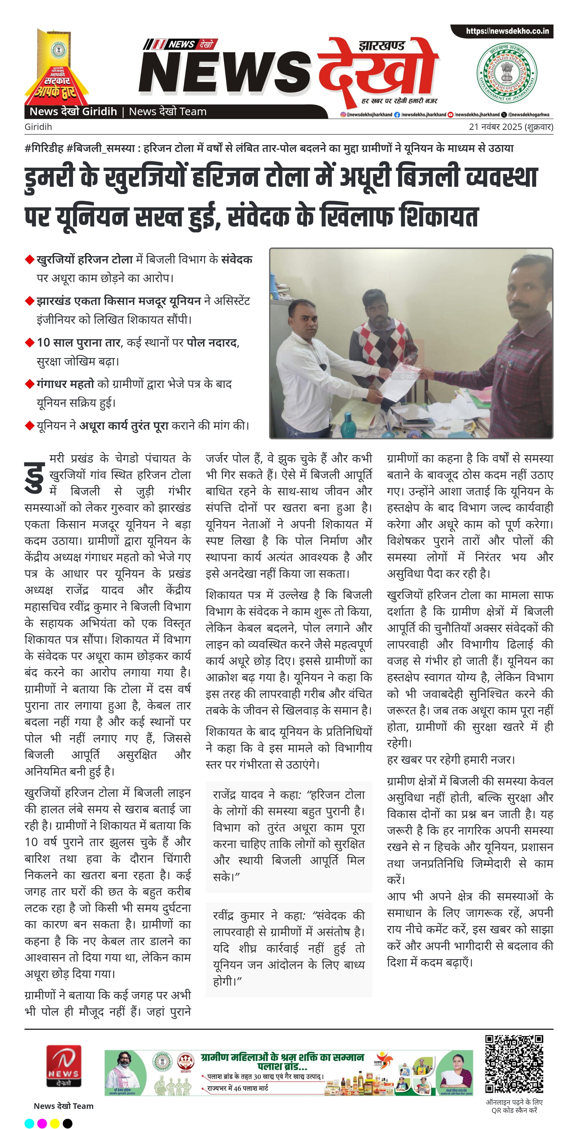 #गिरिडीह #बिजली_समस्या : हरिजन टोला में वर्षों से लंबित तार-पोल बदलने का मुद्दा ग्रामीणों ने यूनियन के माध्यम से उठाया