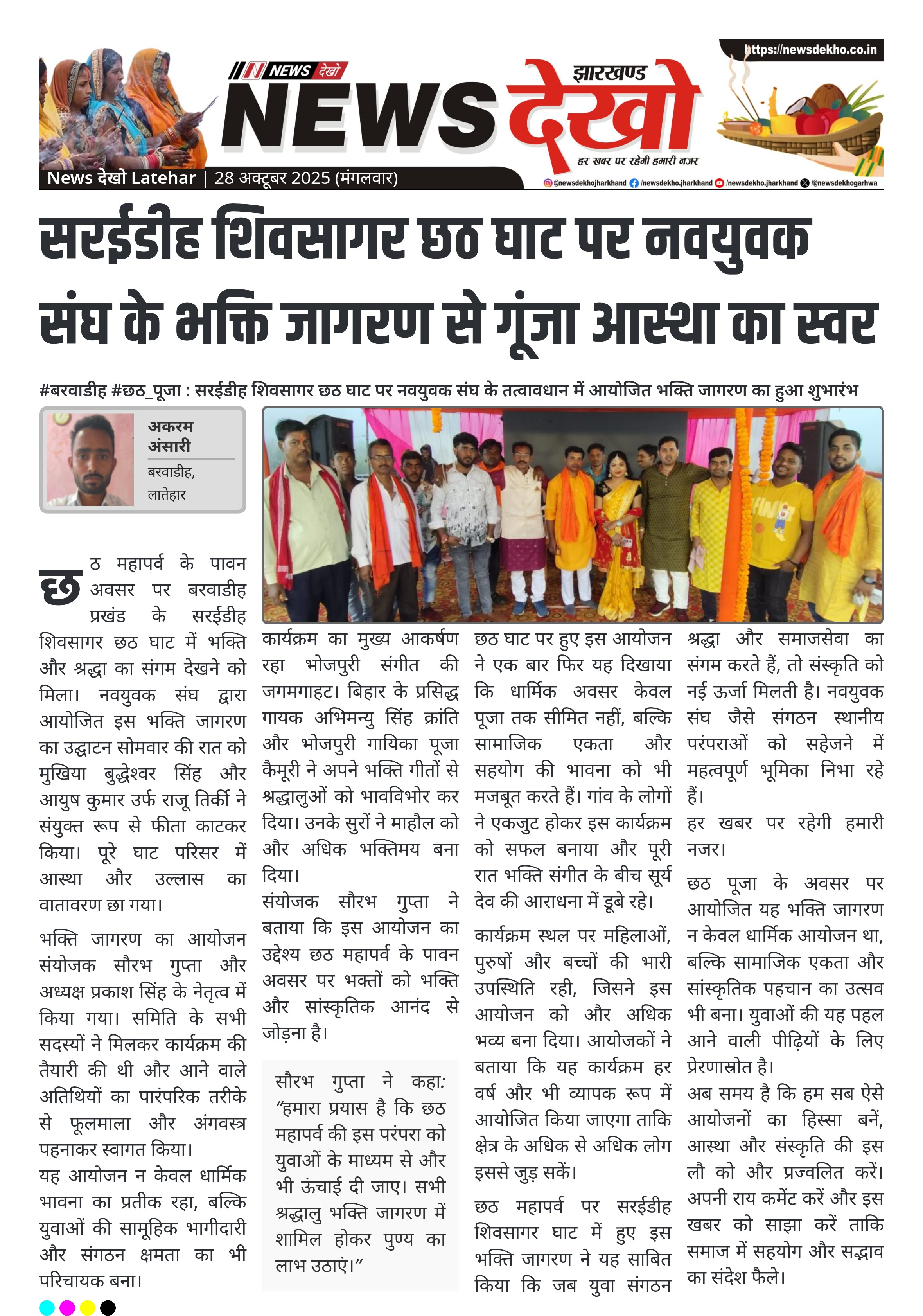 - सरईडीह शिवसागर छठ घाट में नवयुवक संघ की ओर से भक्ति जागरण कार्यक्रम आयोजित किया गया।