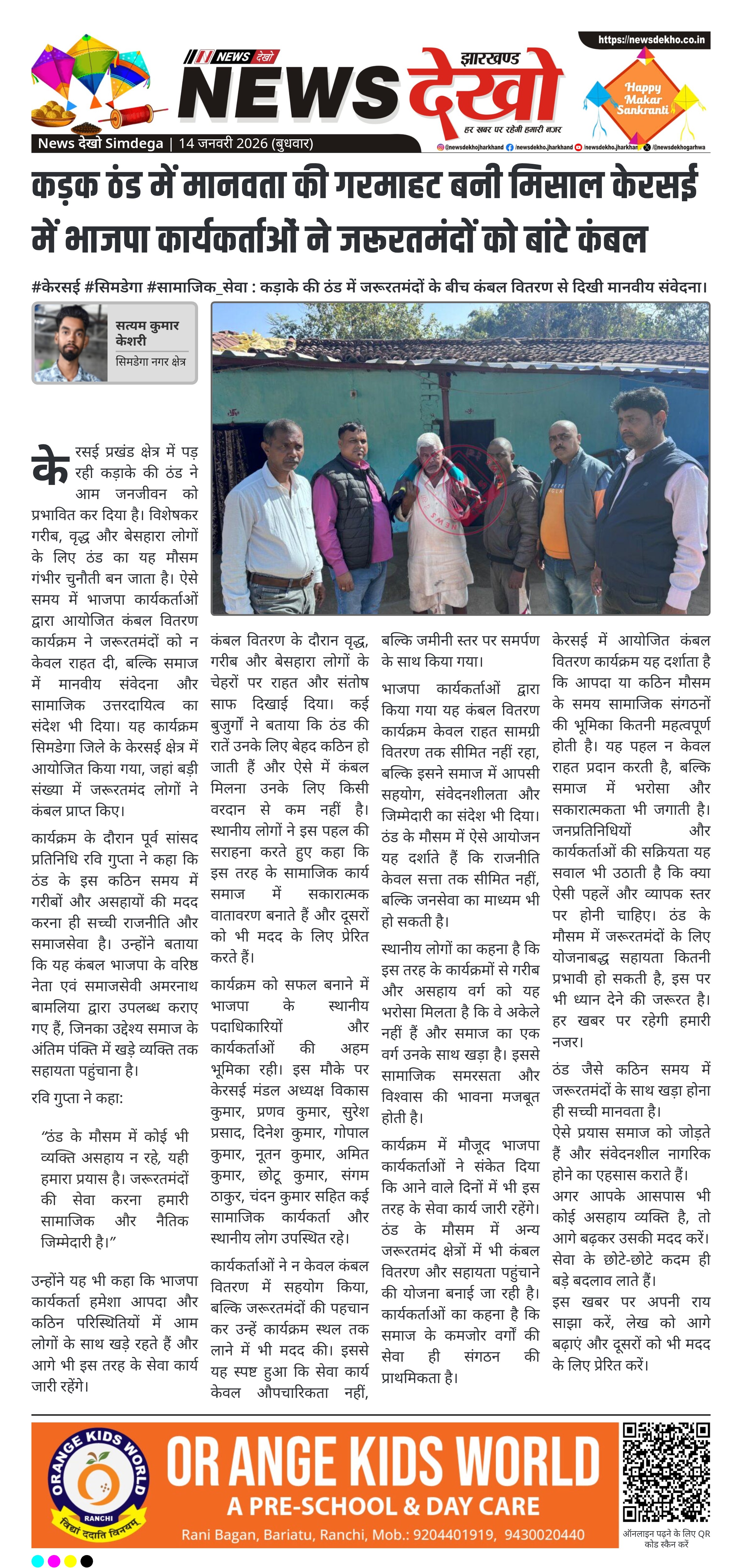 - केरसई, सिमडेगा में भाजपा कार्यकर्ताओं द्वारा जरूरतमंदों को कंबल वितरण।