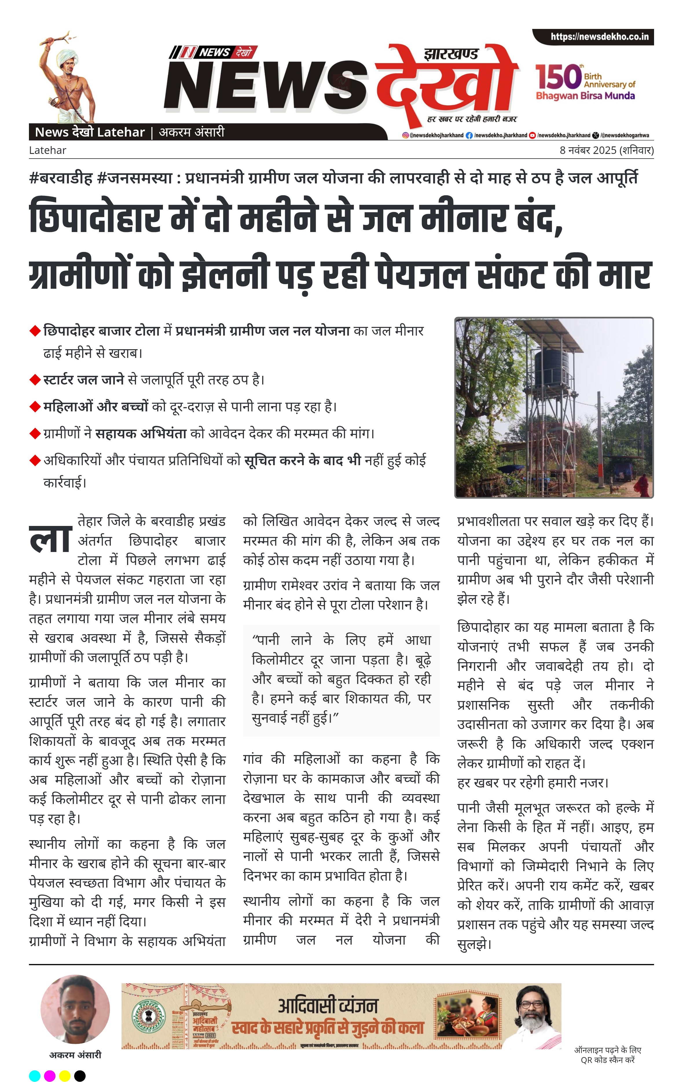 लातेहार जिले के बरवाडीह प्रखंड अंतर्गत छिपादोहर बाजार टोला में पिछले लगभग ढाई महीने से पेयजल संकट गहराता जा रहा है। प्रधानमंत्री ग्रामीण जल नल योजना के तहत लगाया गया जल मीनार लंबे समय से खराब अवस्था में है, जिससे सैकड़ों ग्रामीणों की जलापूर्ति ठप पड़ी है।