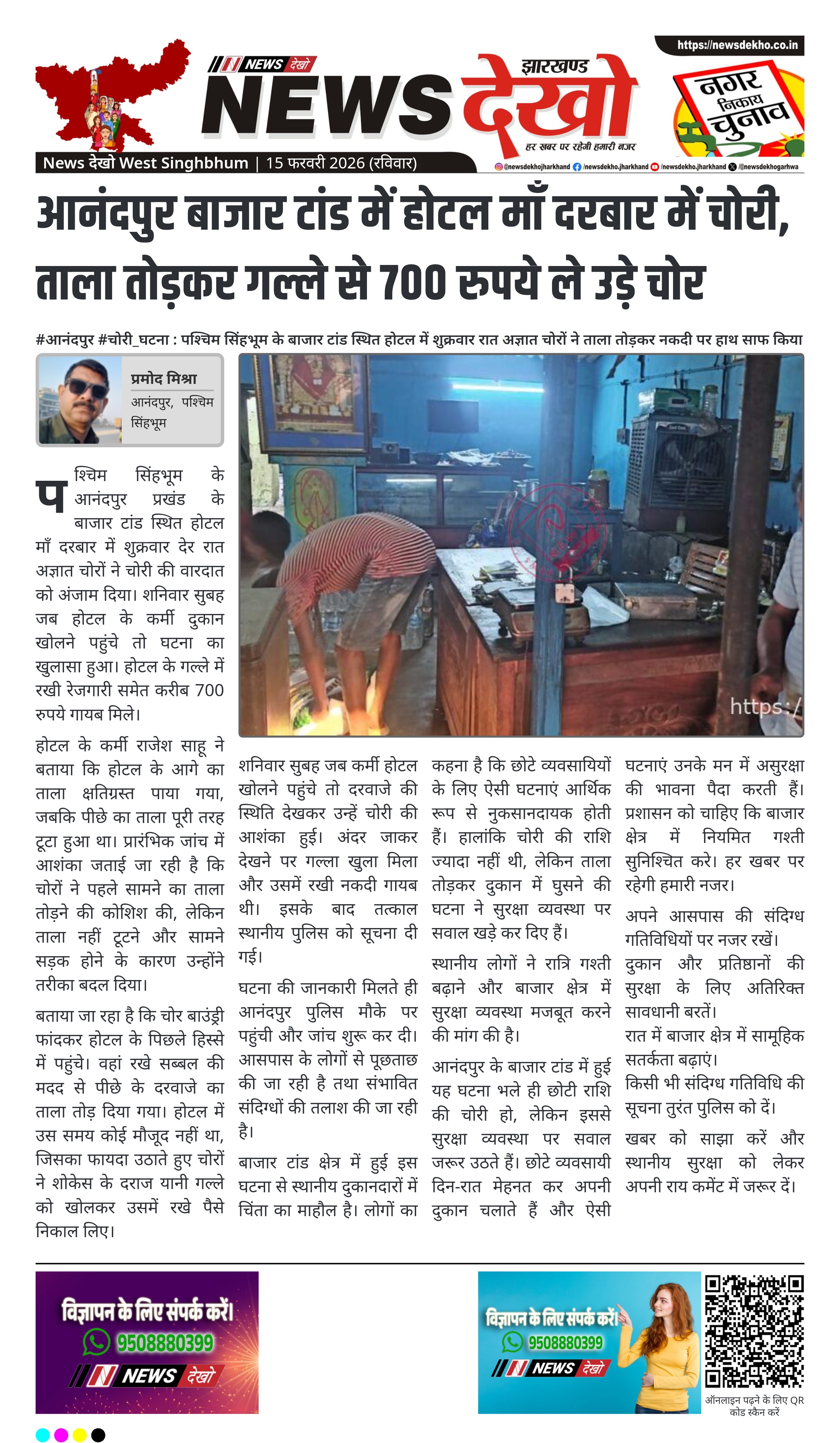 #आनंदपुर #चोरी_घटना : पश्चिम सिंहभूम के बाजार टांड स्थित होटल में शुक्रवार रात अज्ञात चोरों ने ताला तोड़कर नकदी पर हाथ साफ किया।