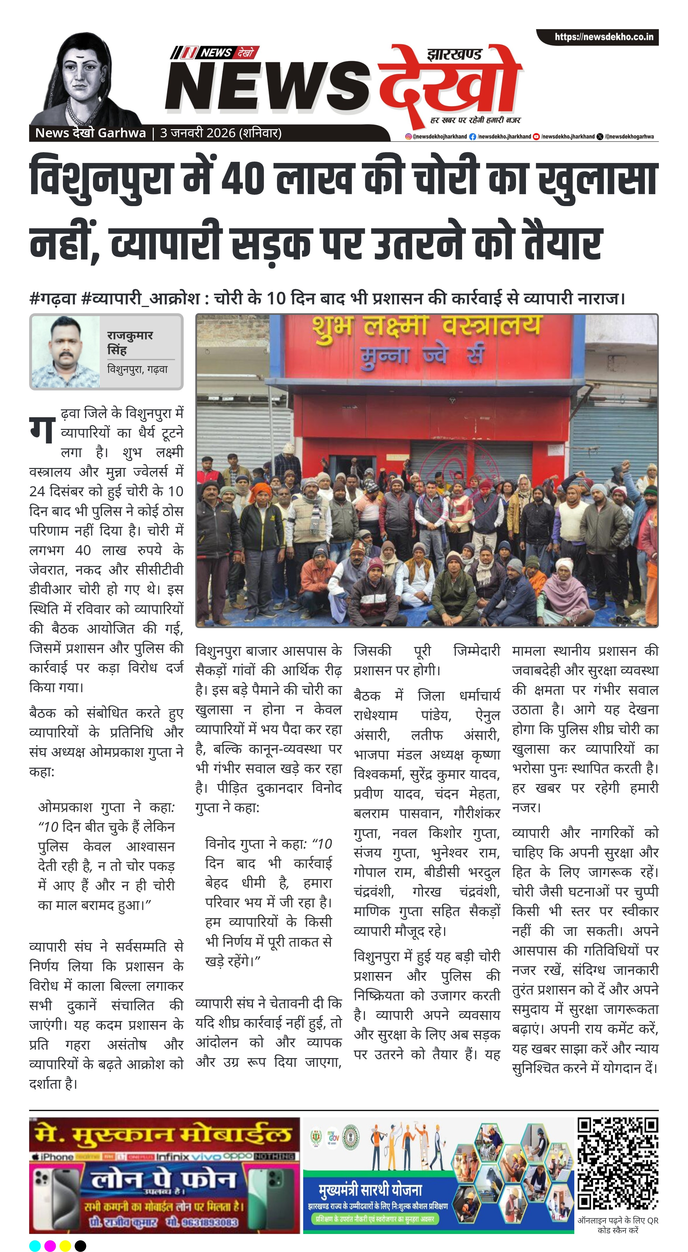 गढ़वा जिले के विशुनपुरा में शुभ लक्ष्मी वस्त्रालय और मुन्ना ज्वेलर्स में 24 दिसंबर की रात हुई करीब 40 लाख रुपये की चोरी के 10 दिन बीत जाने के बावजूद पुलिस कोई ठोस कार्रवाई नहीं कर पाई है। स्थानीय व्यापारियों ने प्रशासन के खिलाफ काला बिल्ला लगाकर विरोध करने का निर्णय लिया। बैठक में व्यापारी संघ अध्यक्ष ओमप्रकाश गुप्ता सहित सैकड़ों व्यापारियों ने शामिल होकर अपने आक्रोश और चिंता व्यक्त की। यह मामला कानून-व्यवस्था पर गंभीर सवाल खड़ा कर रहा है।