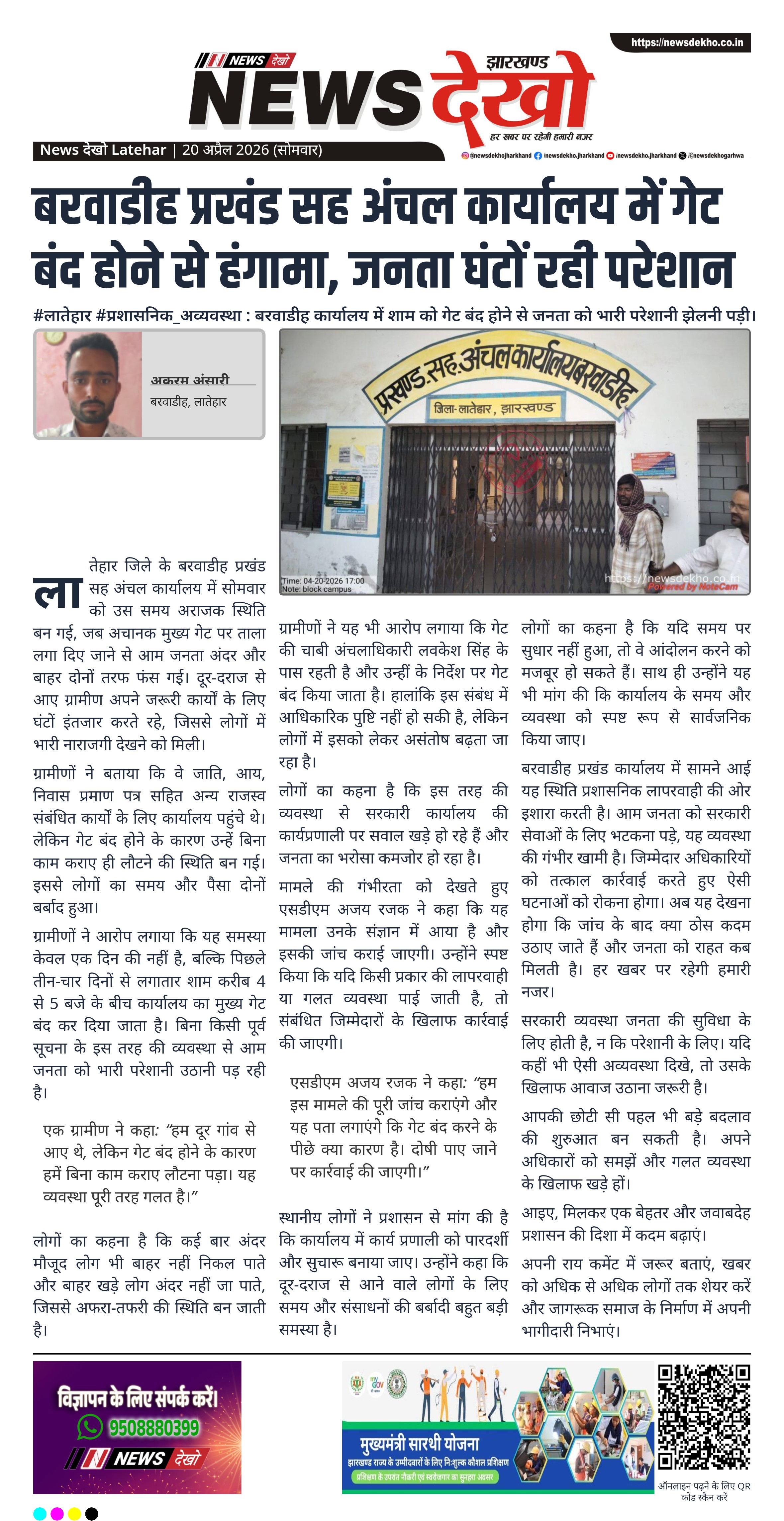 ग्रामीणों ने आरोप लगाया कि यह समस्या केवल एक दिन की नहीं है, बल्कि पिछले तीन-चार दिनों से लगातार शाम करीब 4 से 5 बजे के बीच कार्यालय का मुख्य गेट बंद कर दिया जाता है। बिना किसी पूर्व सूचना के इस तरह की व्यवस्था से आम जनता को भारी परेशानी उठानी पड़ रही है।