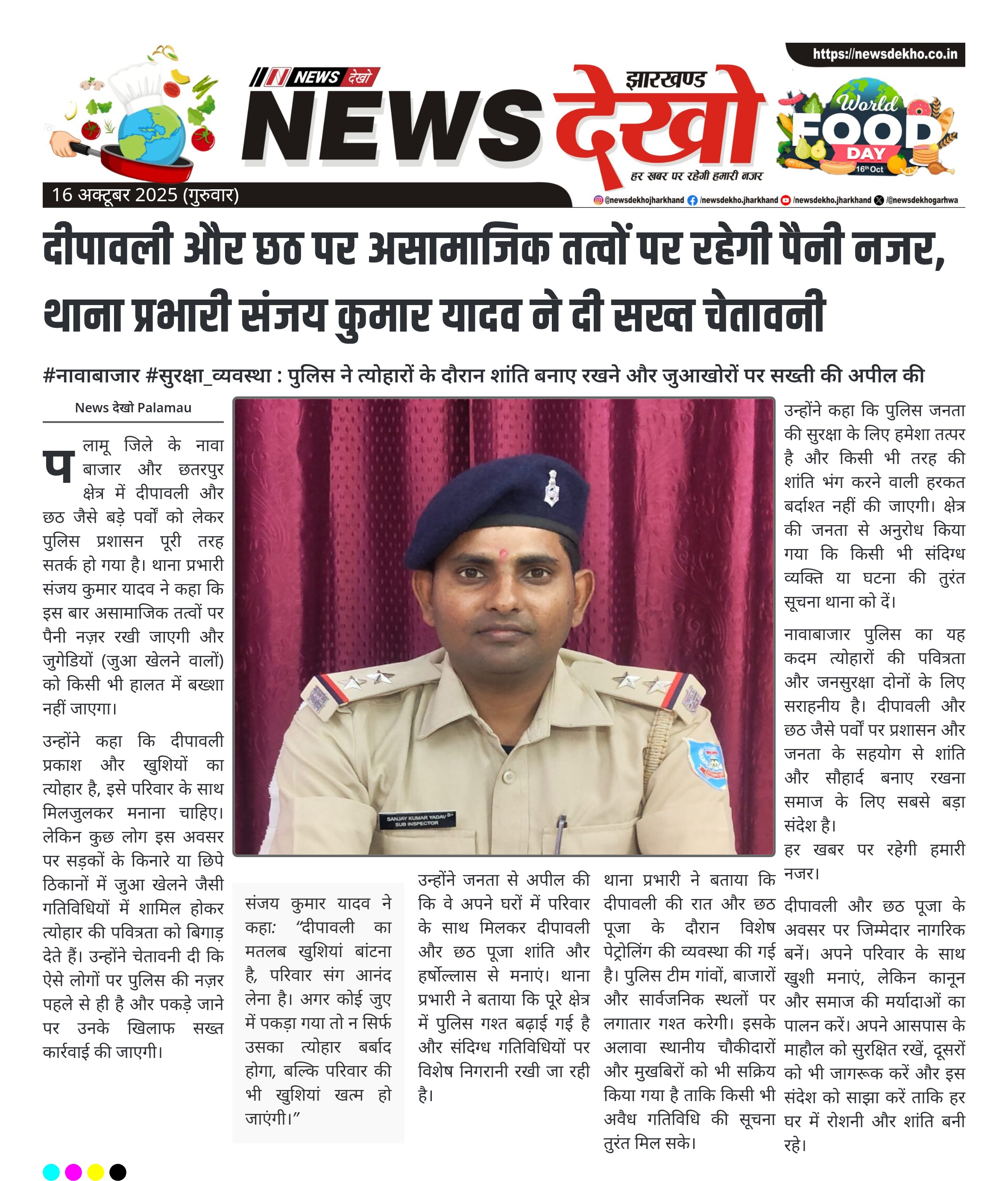 पलामू जिले के नावा बाजार और छतरपुर क्षेत्र में दीपावली और छठ जैसे बड़े पर्वों को लेकर पुलिस प्रशासन पूरी तरह सतर्क हो गया है। थाना प्रभारी संजय कुमार यादव ने कहा कि इस बार असामाजिक तत्वों पर पैनी नज़र रखी जाएगी और जुगेडियों (जुआ खेलने वालों) को किसी भी हालत में बख्शा नहीं जाएगा।