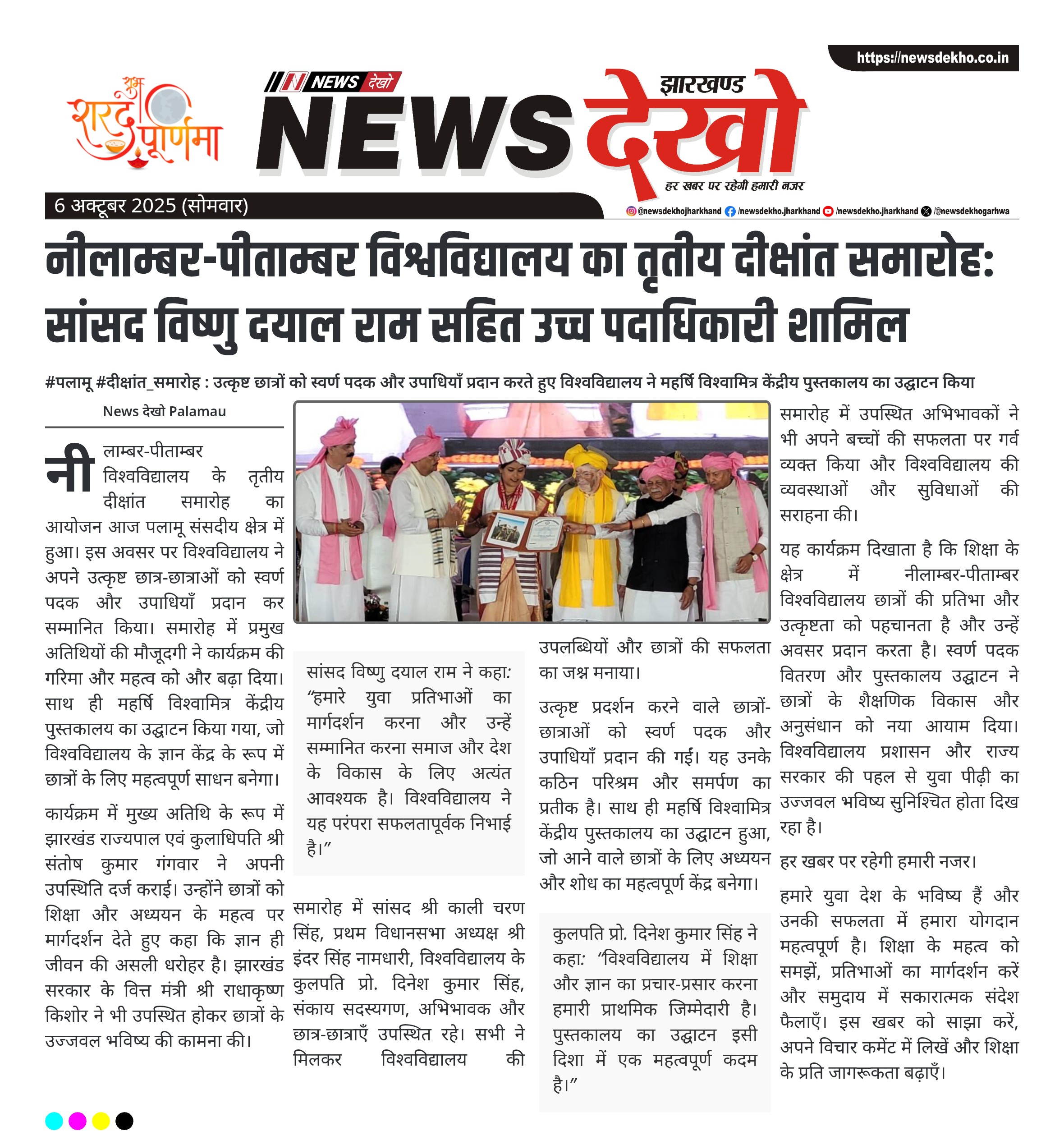 नीलाम्बर-पीताम्बर विश्वविद्यालय के तृतीय दीक्षांत समारोह का आयोजन आज पलामू संसदीय क्षेत्र में हुआ। इस अवसर पर विश्वविद्यालय ने अपने उत्कृष्ट छात्र-छात्राओं को स्वर्ण पदक और उपाधियाँ प्रदान कर सम्मानित किया। समारोह में प्रमुख अतिथियों की मौजूदगी ने कार्यक्रम की गरिमा और महत्व को और बढ़ा दिया। साथ ही महर्षि विश्वामित्र केंद्रीय पुस्तकालय का उद्घाटन किया गया, जो विश्वविद्यालय के ज्ञान केंद्र के रूप में छात्रों के लिए महत्वपूर्ण साधन बनेगा।