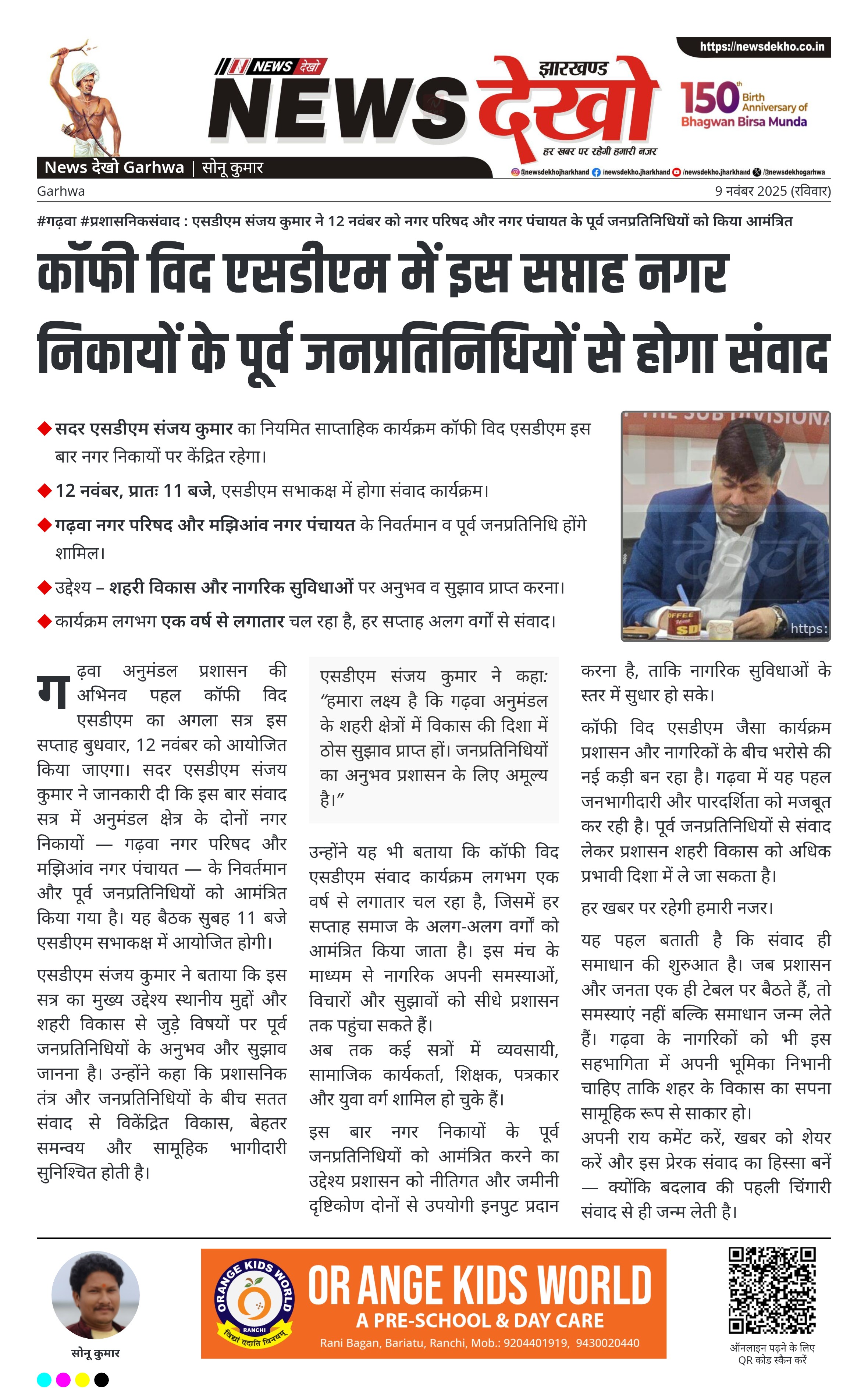 गढ़वा अनुमंडल प्रशासन की अभिनव पहल कॉफी विद एसडीएम का अगला सत्र इस सप्ताह बुधवार, 12 नवंबर को आयोजित किया जाएगा। सदर एसडीएम संजय कुमार ने जानकारी दी कि इस बार संवाद सत्र में अनुमंडल क्षेत्र के दोनों नगर निकायों — गढ़वा नगर परिषद और मझिआंव नगर पंचायत — के निवर्तमान और पूर्व जनप्रतिनिधियों को आमंत्रित किया गया है। यह बैठक सुबह 11 बजे एसडीएम सभाकक्ष में आयोजित होगी।