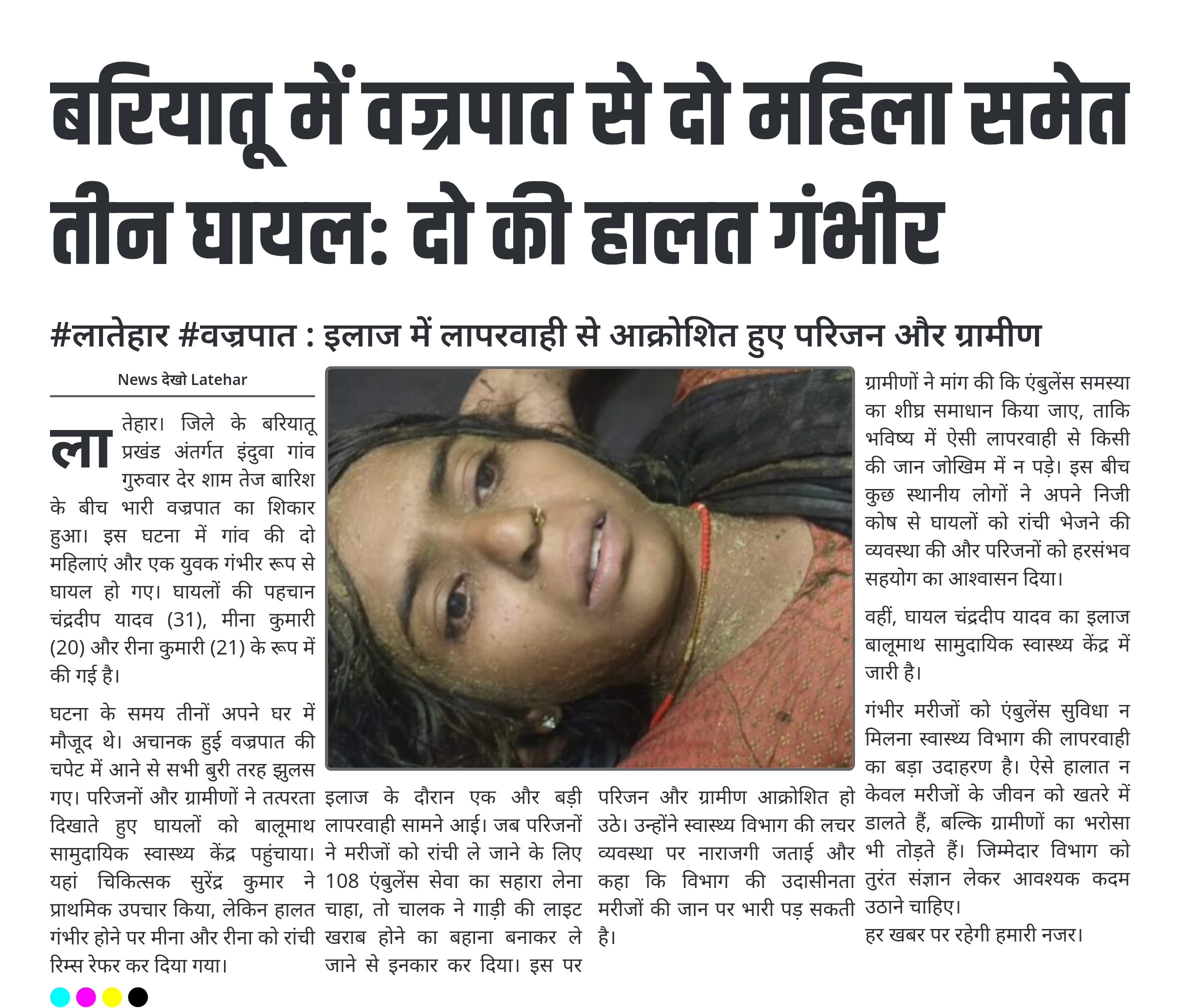- घायलों में चंद्रदीप यादव, मीना कुमारी और रीना कुमारी शामिल।