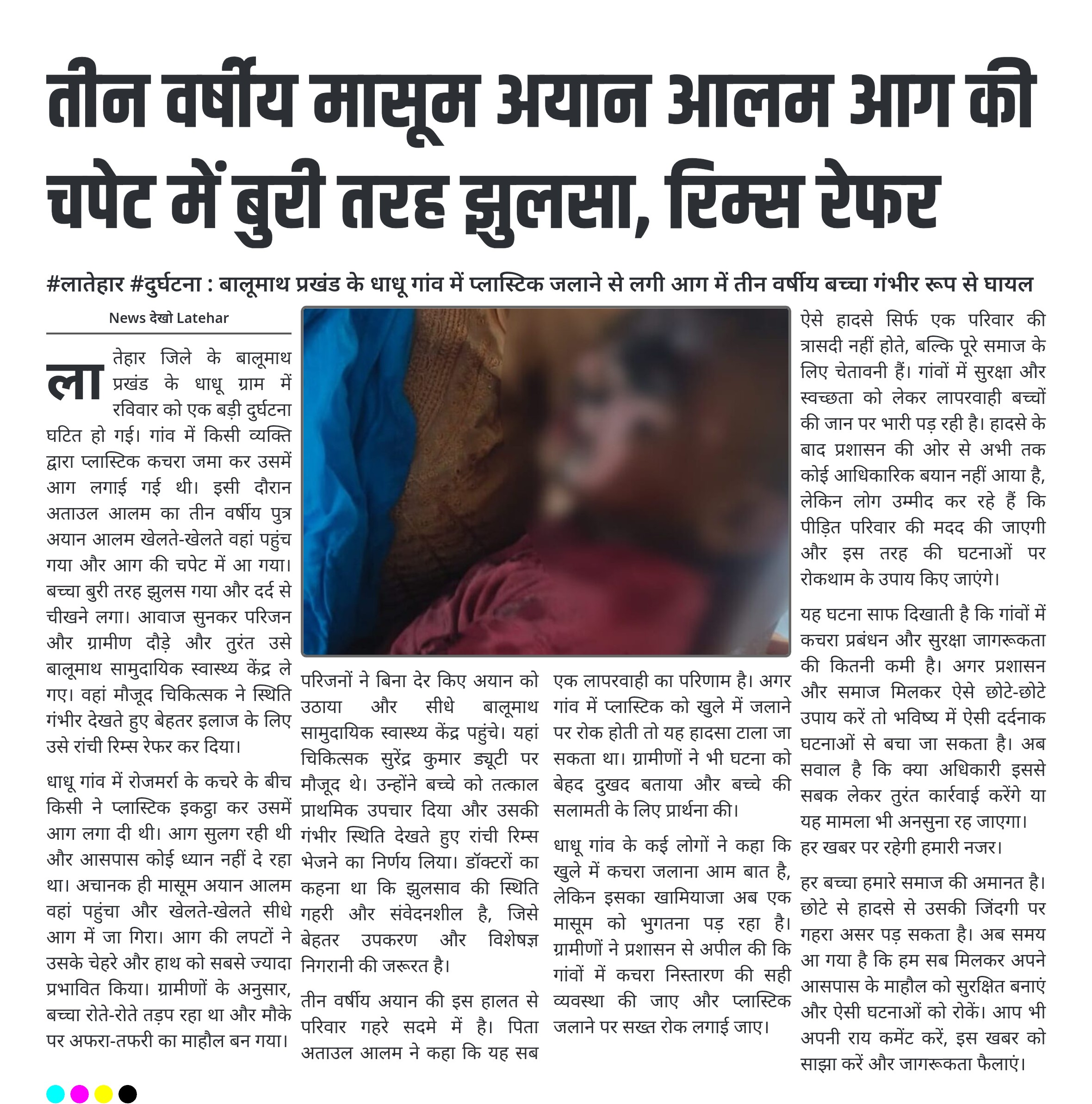 #लातेहार #दुर्घटना : बालूमाथ प्रखंड के धाधू गांव में प्लास्टिक जलाने से लगी आग में तीन वर्षीय बच्चा गंभीर रूप से घायल