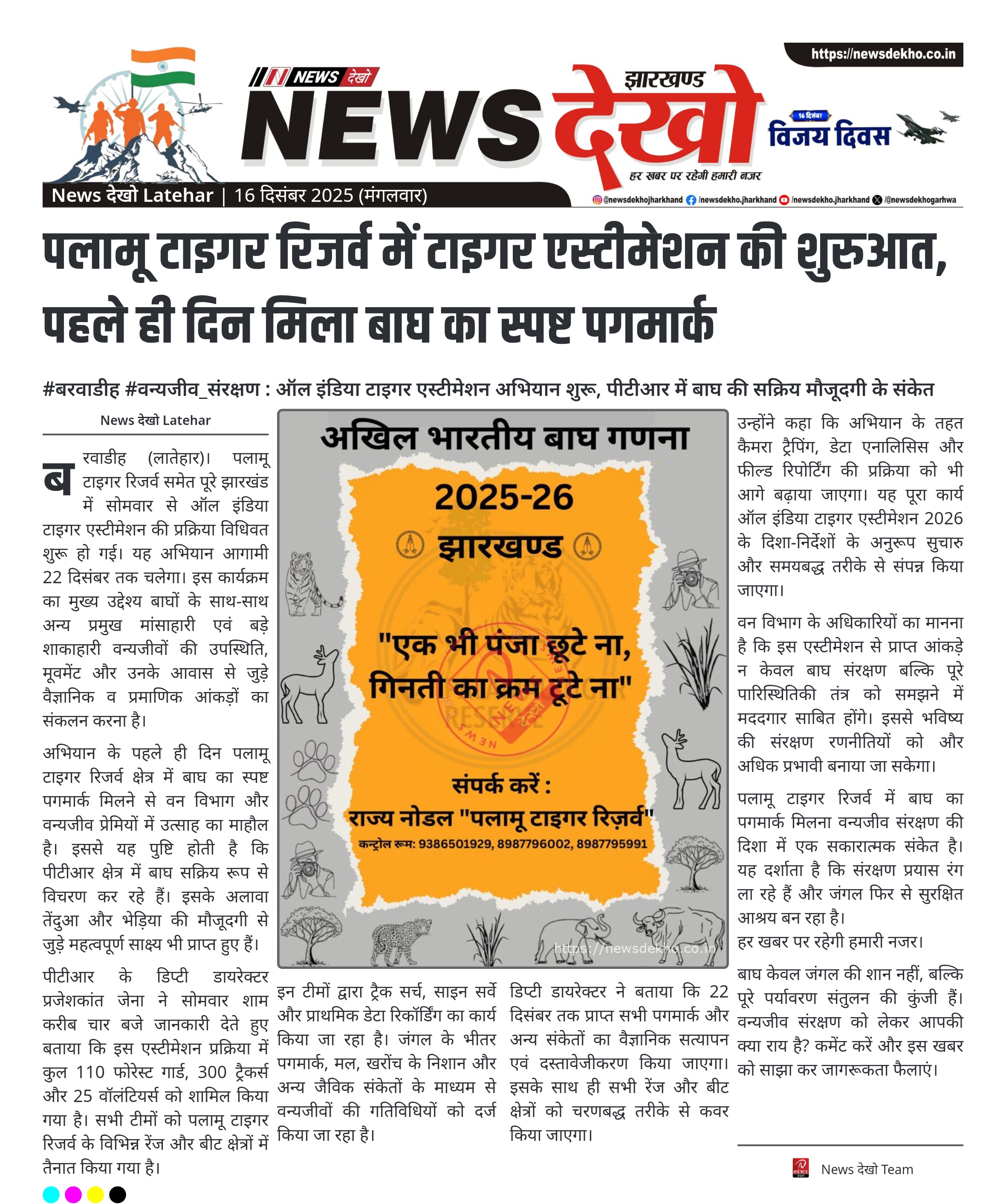 • पलामू टाइगर रिजर्व सहित पूरे झारखंड में टाइगर एस्टीमेशन प्रक्रिया शुरू।