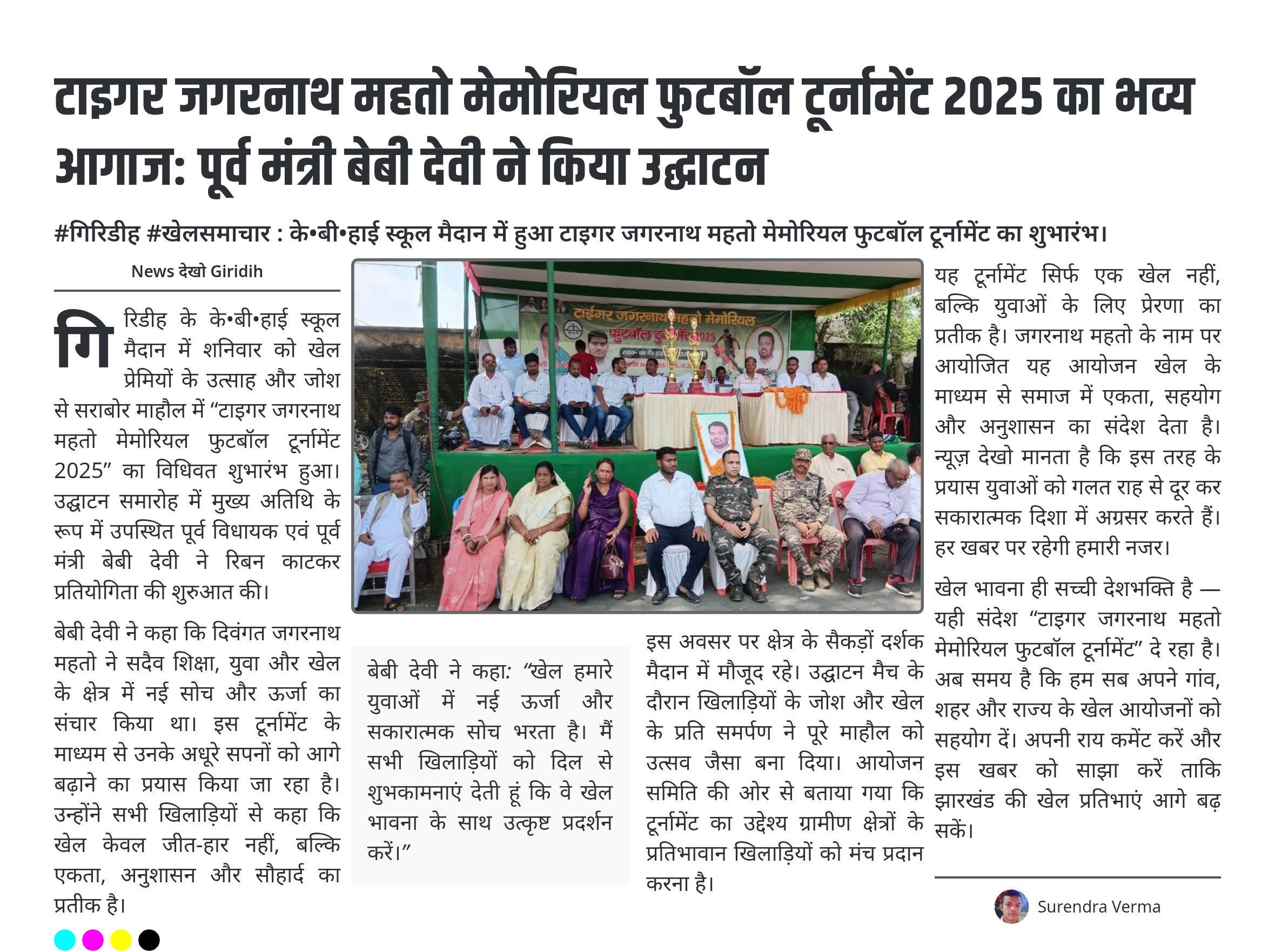 बेबी देवी ने कहा कि दिवंगत जगरनाथ महतो ने सदैव शिक्षा, युवा और खेल के क्षेत्र में नई सोच और ऊर्जा का संचार किया था। इस टूर्नामेंट के माध्यम से उनके अधूरे सपनों को आगे बढ़ाने का प्रयास किया जा रहा है। उन्होंने सभी खिलाड़ियों से कहा कि खेल केवल जीत-हार नहीं, बल्कि एकता, अनुशासन और सौहार्द का प्रतीक है।