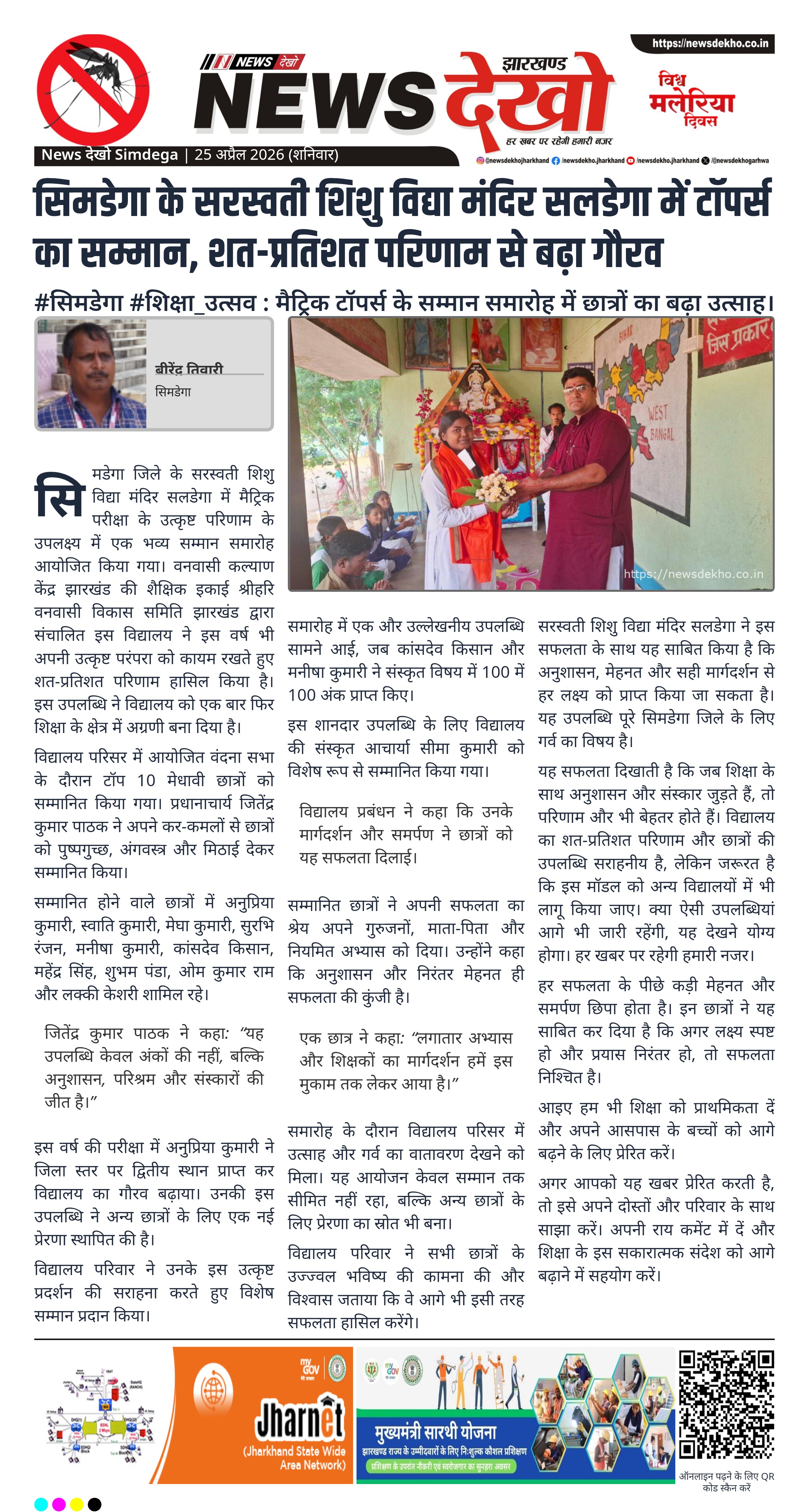 - सरस्वती शिशु विद्या मंदिर सलडेगा में टॉपर्स का सम्मान हुआ।